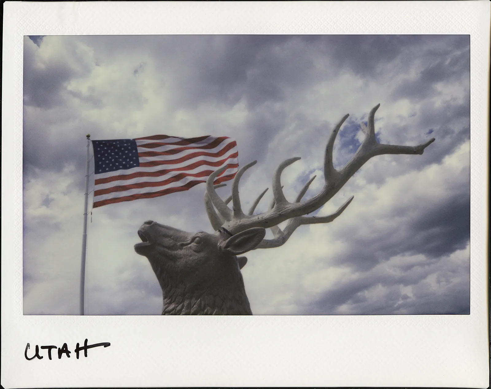 A U.S. flag blows in the wind behind a deer statue in Utah. Photo taken using a Fujifilm Instax Wide instant film camera, hand written and flatbed scanned