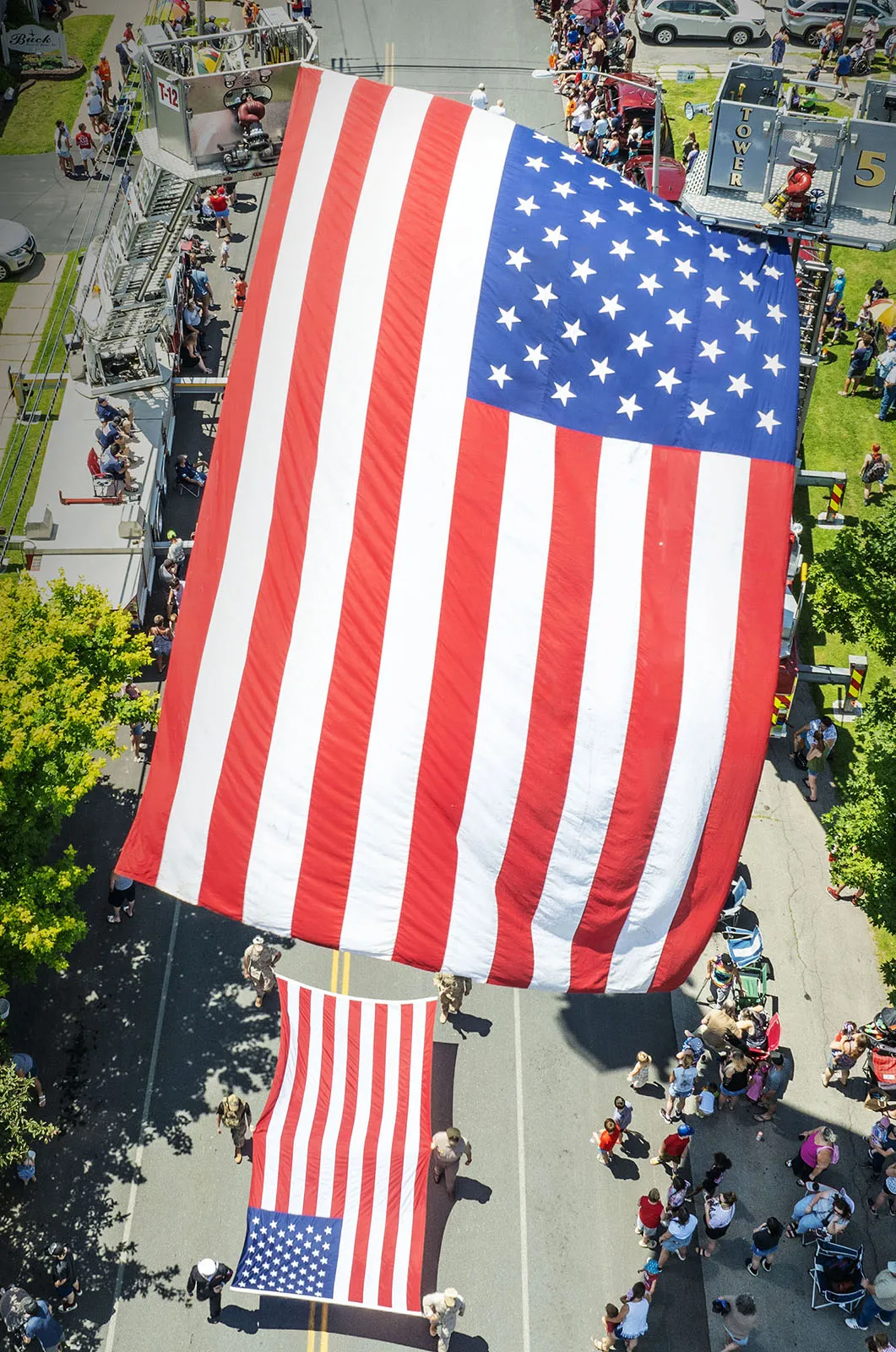 Members of the Norwood American Legion, carrying an American flag, pass under an American flag draped between the towers of two aerial fire trucks on July 4 as the Norwood (NY) Volunteer Fire Department parade travels down Spring Street in the Village.