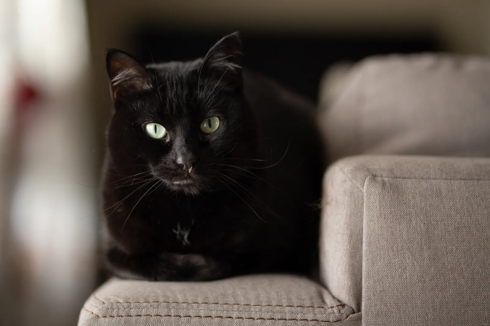 Cat contentedly bird watching from her perch on the arm of the couch, just the right size for her.