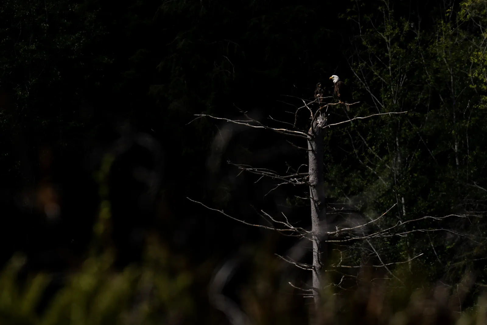 A bald Eagle and it's mate are highlighted by a break in the clouds while watching over a nest outside of Forks, Washington.