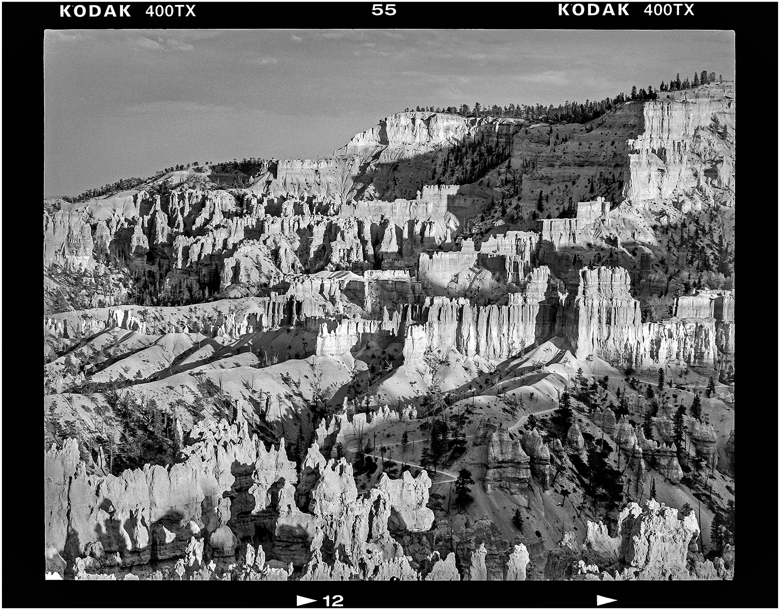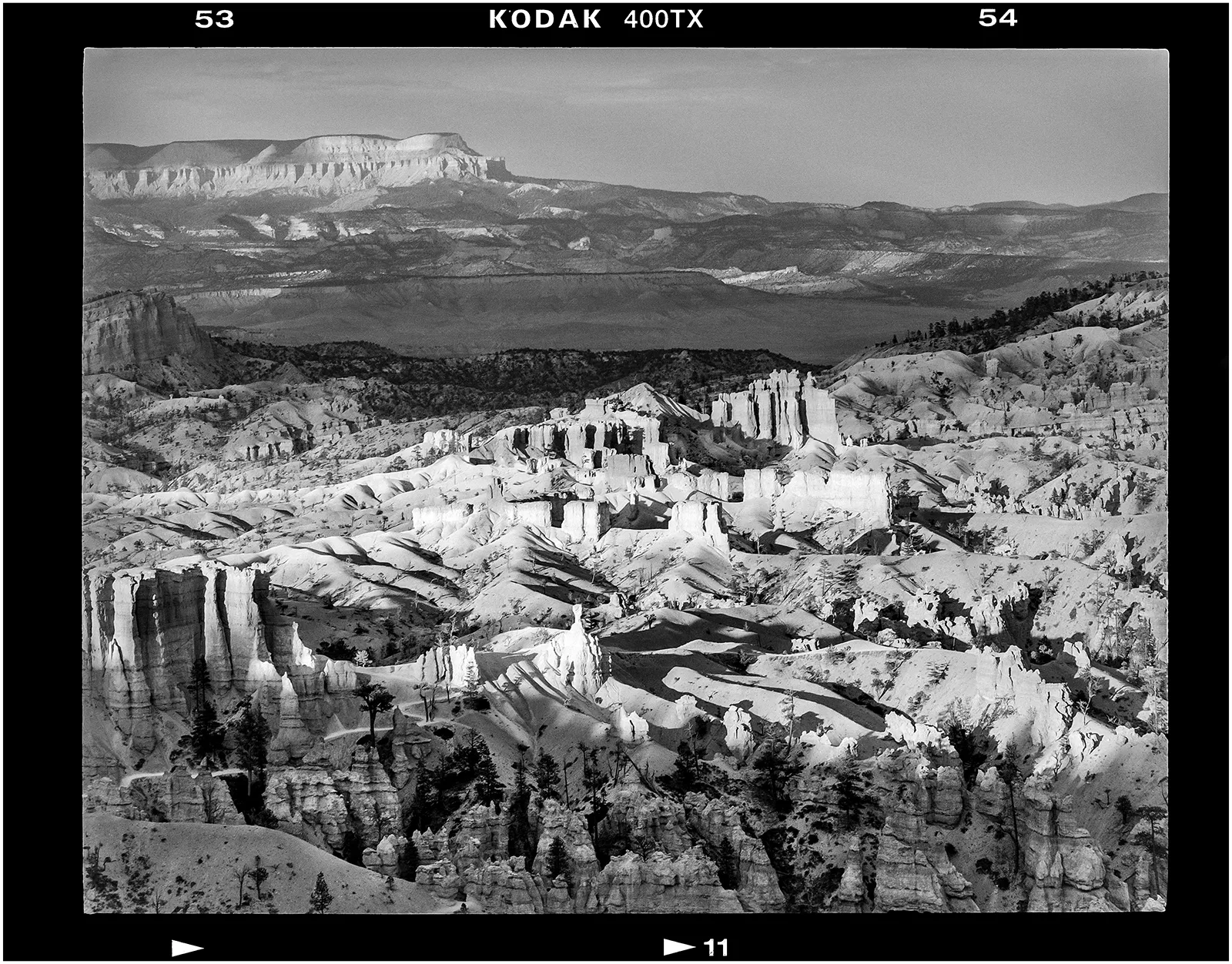 A photo of Bryce Canyon taken at Sunset Point using a Pentax 67 film camera on Tri-X 120 film. The photo was developed and scanned to include the edge number of the film.