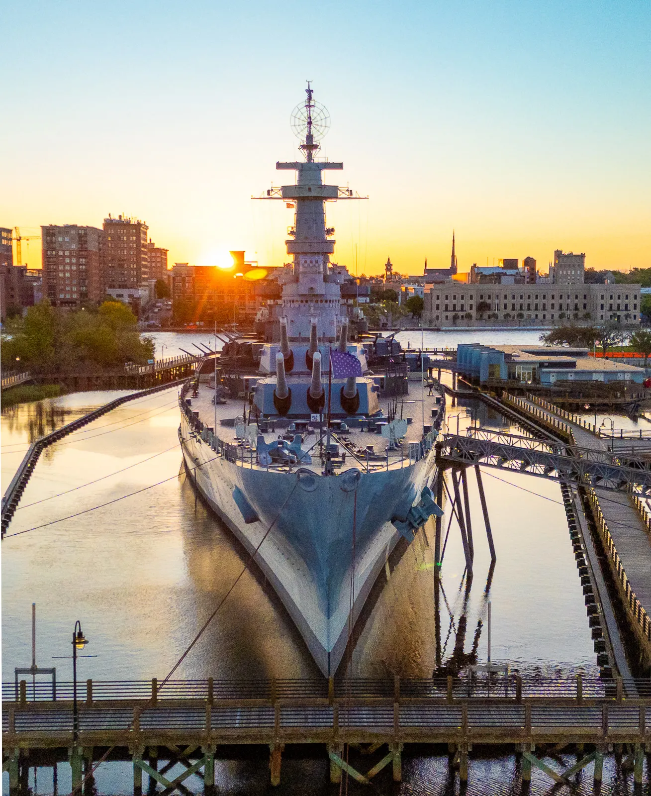 Sun rises behind The U.S.S. North Carolina, a decommissioned World War II battleship, permanently moored as a memorial and historic site in Wilmington on the Cape Fear River. The ship weights 36,000 tons and is 728 feet in length. The retired battleship serves as commemoration of the heroism of U.S. sailors and soldiers from North Carolina in World War II.