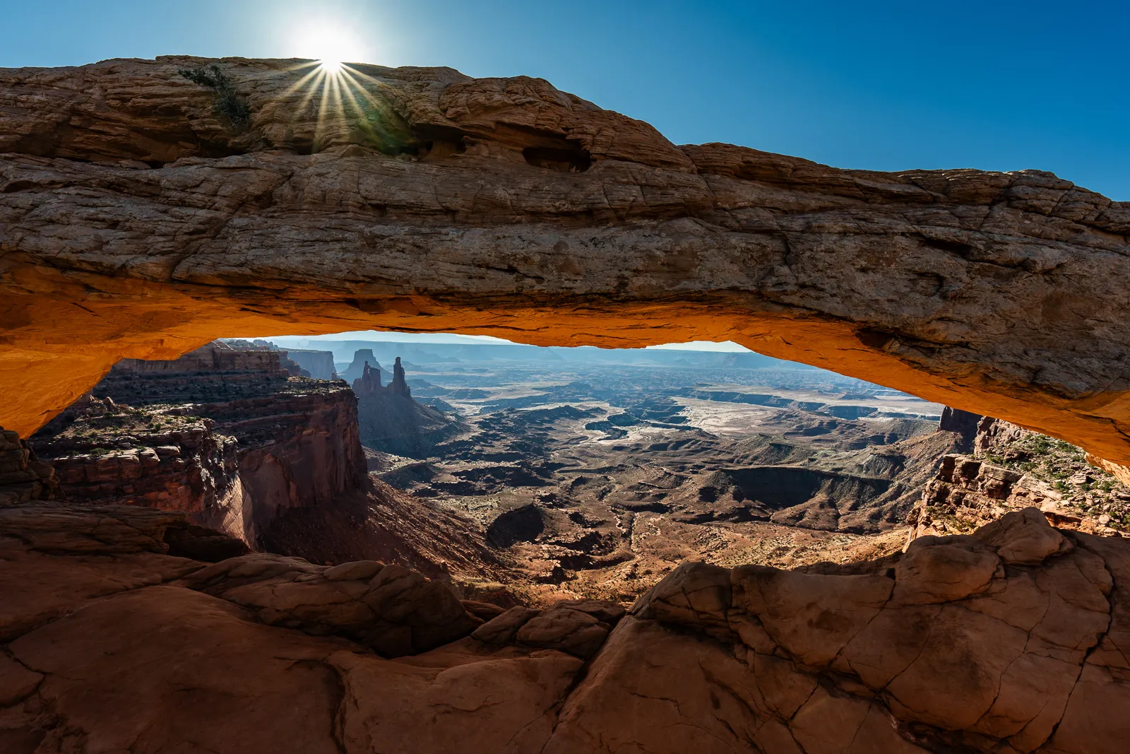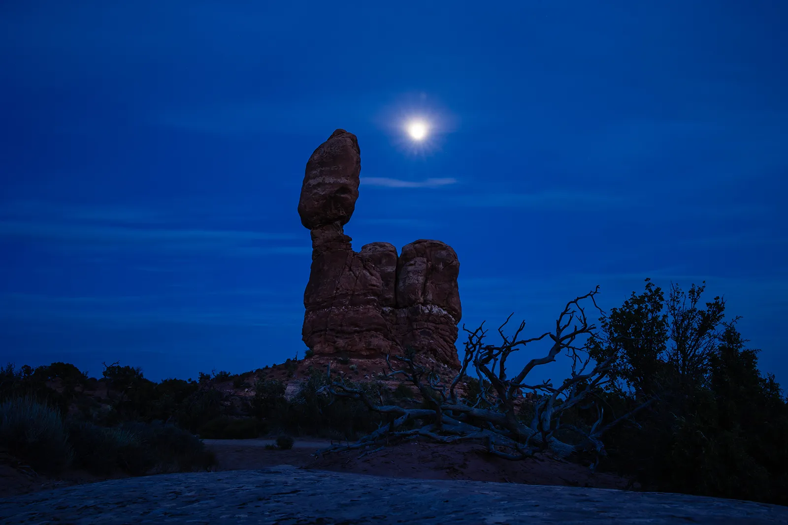 Balanced Rock, seen at blue hour and illuminated by a full moon, at Arches National Park in June 2024.