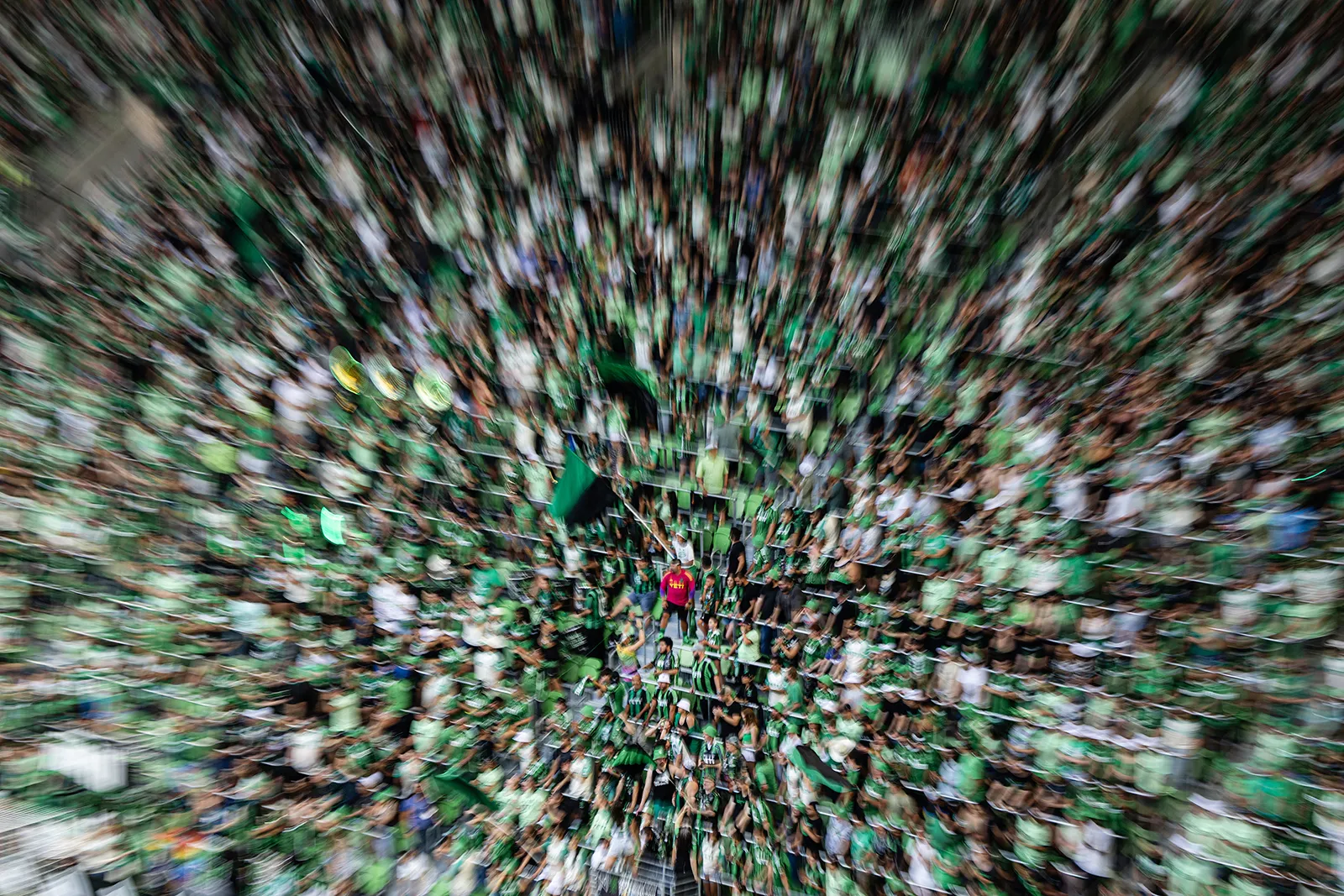 A slow zooming exposure of an Austin FC supporter wearing a hot pink jersey standing out amongst a sea of green in the supporter section at the Austin FC vs. Seattle Sounders FC game at Q2 Stadium in July 2024.