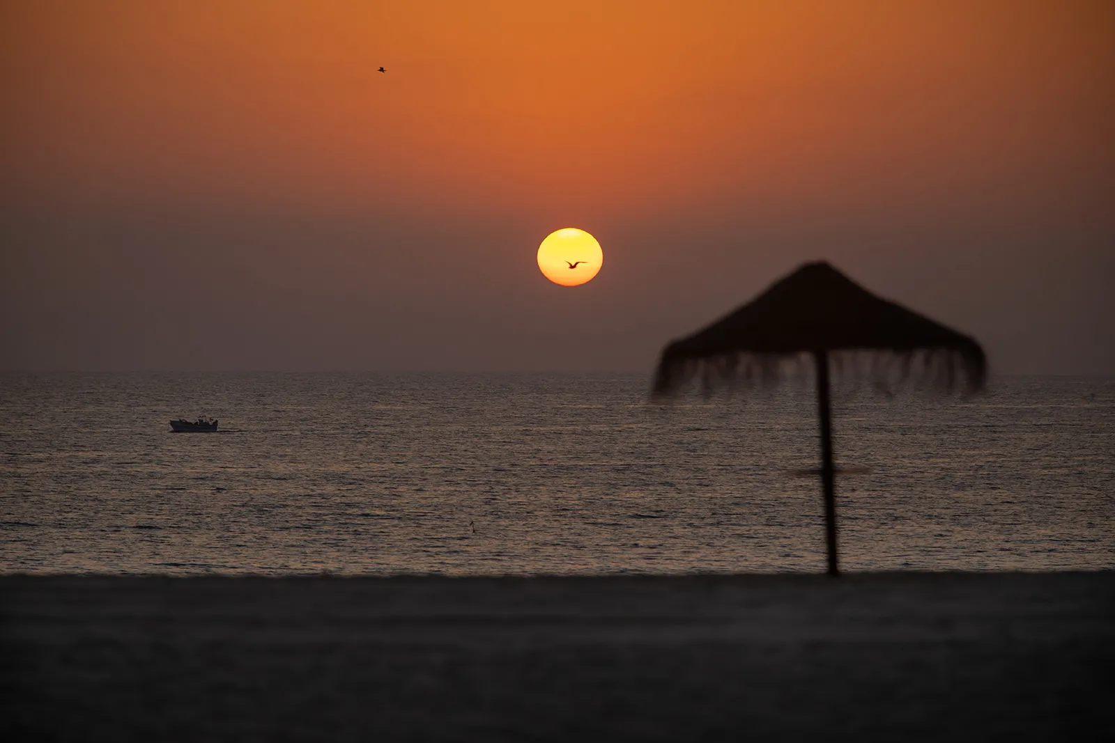 We were eating at a restaurant in Nazaré, when I noticed the sunset. I politely excused myself and ran to the vehicle to get my camera. I hurried across the street, then the sand, to stop briefly to compose the photo, and myself. I saw the seagull and waited, then snap.