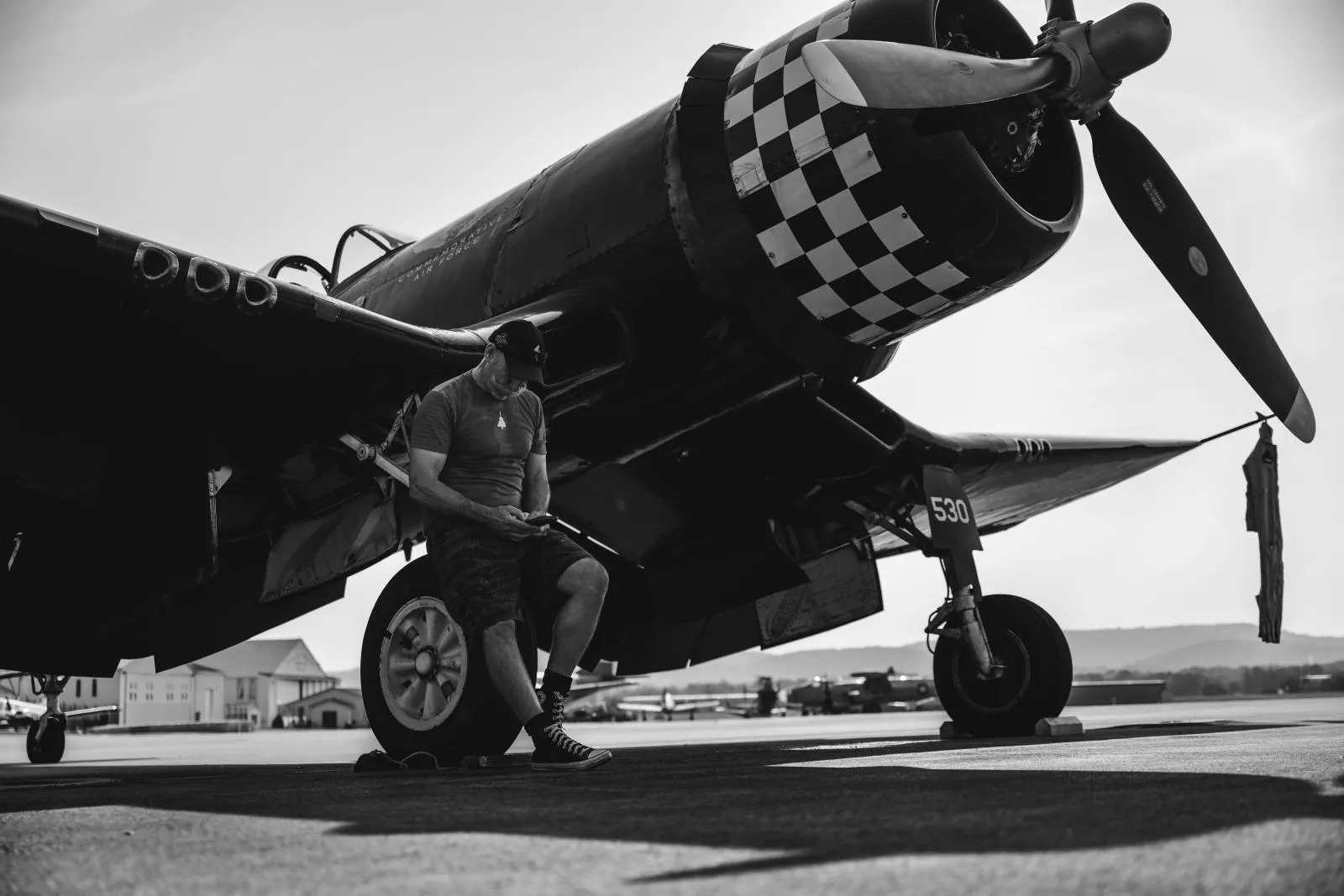 Commemorative Air Force Pilot Mark "Mutha" Hubbard checks the weather along his flight path while waiting to fly the FG-1D Corsair home to Georgia.
