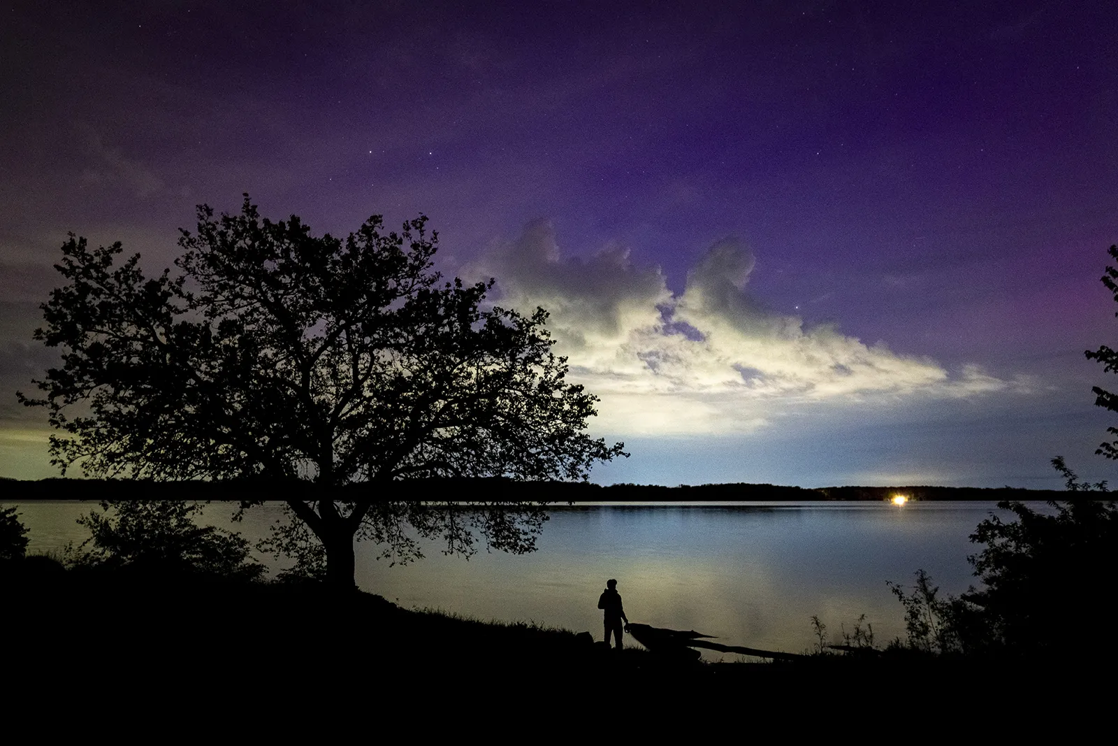 The aurora borealis stretches over Prairie Creek Reservoir in Muncie, IN late in the evening on May 11, 2024.