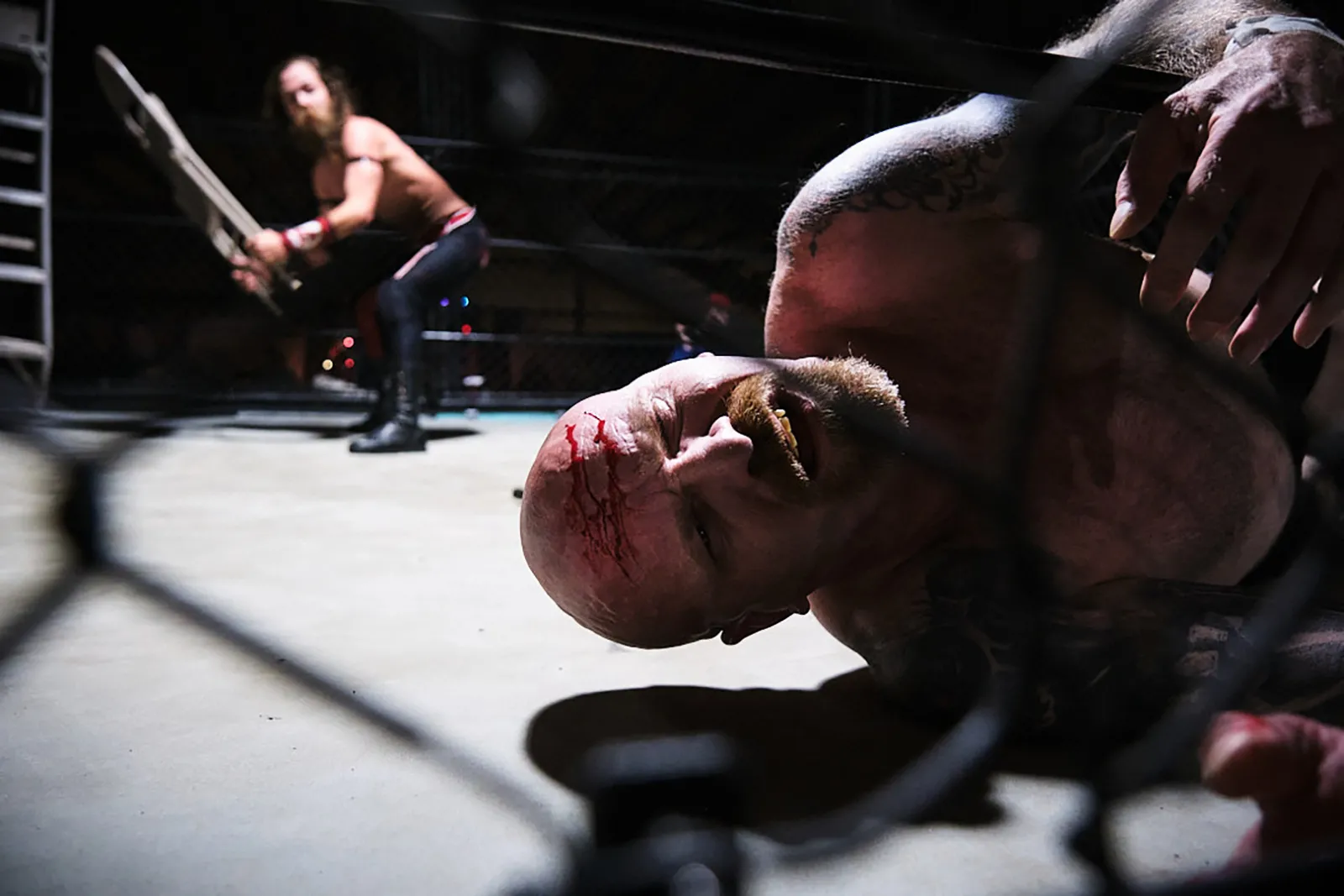 Two wrestlers battle it out at the Muncie Fair Grounds during an Indiana pro wrestling cage match.