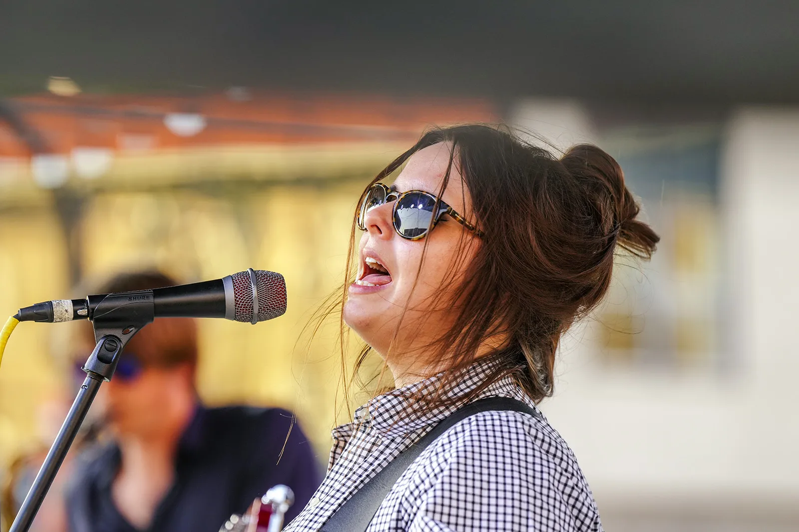 Photo of Nashville recording Artist Bee Taylor shot at Mountain Grrl Experience 2024 sponsored by our university. Photo was taken shot through a equipment case on side of stage to give the darker color around the edges. Performance was at sunset with the final sun rays striking Bee on the right side of the stage giving the warm tones of the day.