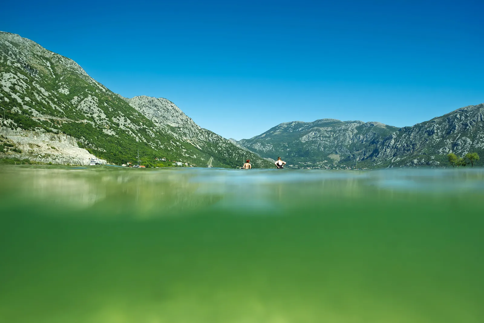 Camera partially submerged in the calm waters of Morinj Beach in the Bay of Kotor, Montenegro.