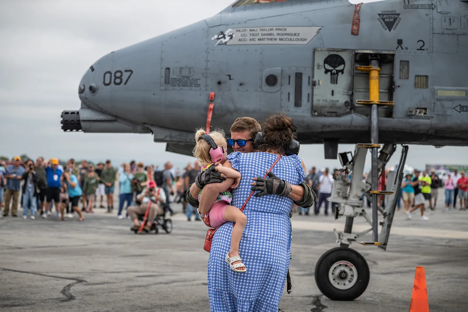 Major Price embraces his family after landing his A-10 Warthog for the final time in the 104th Fighter Squadron's History in Maryland. His A-10 was landed at the Hagerstown Aviation Museum; at the same airport it departed when built by Fairchild nearly 45 years ago.