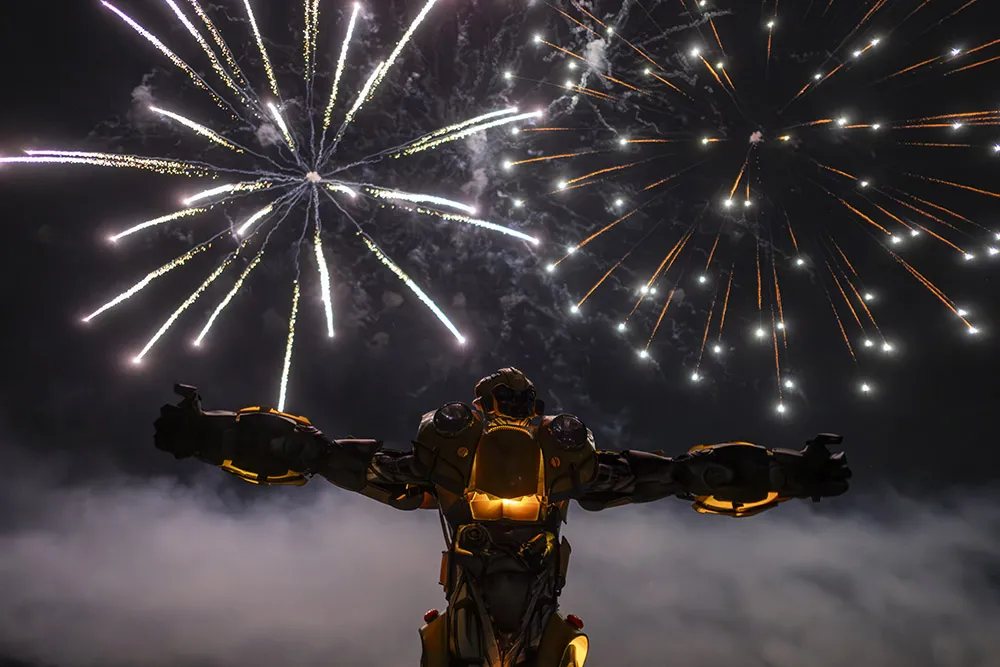 A man dressed as "The Bee" watches fireworks over Bolivar, Ohio during a community fundraising event.