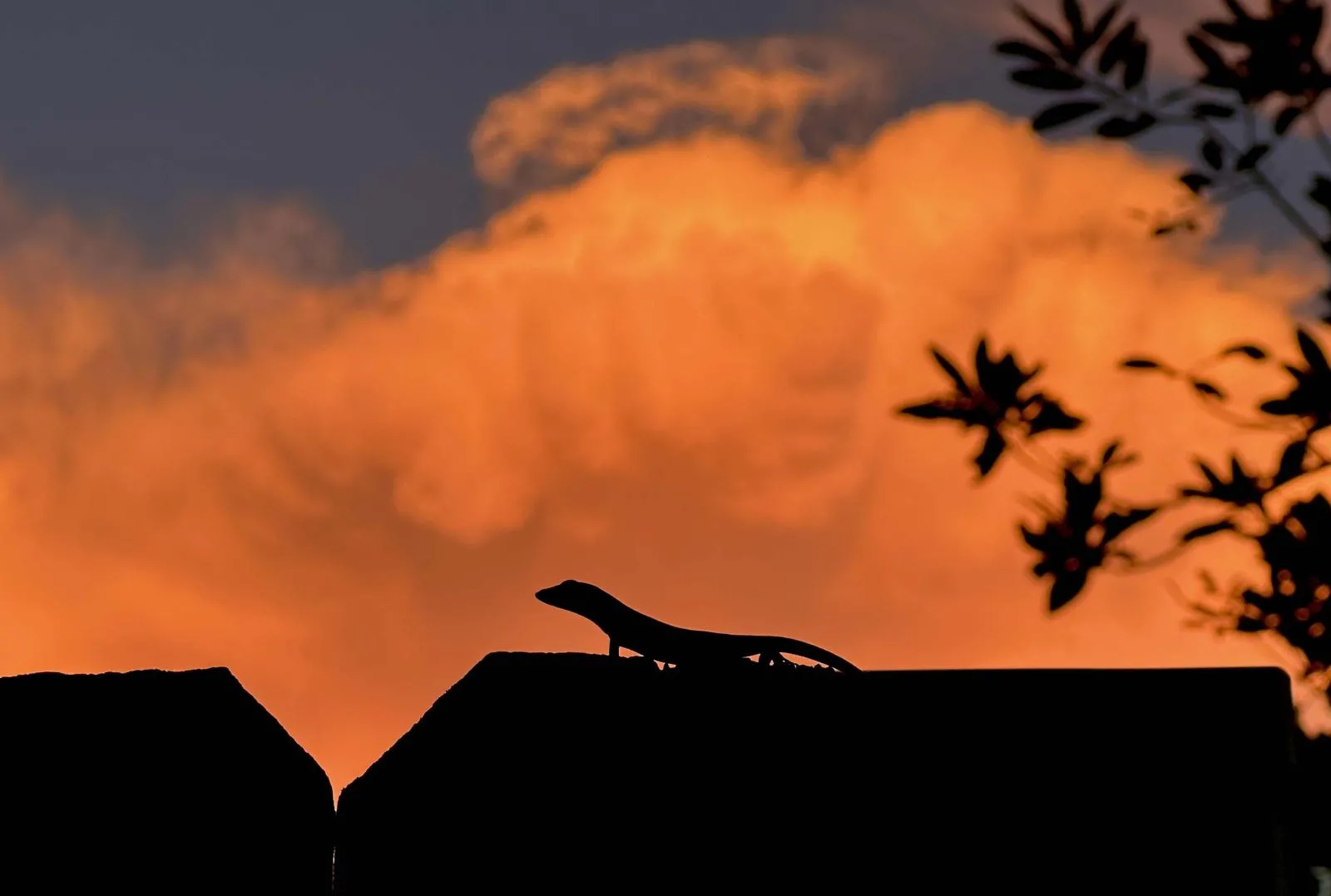 A lizard is perched on a backyard fence as clouds from a thunderstorm are lit by the setting sun on Sept. 27, 2025 in Gainesville, FL.