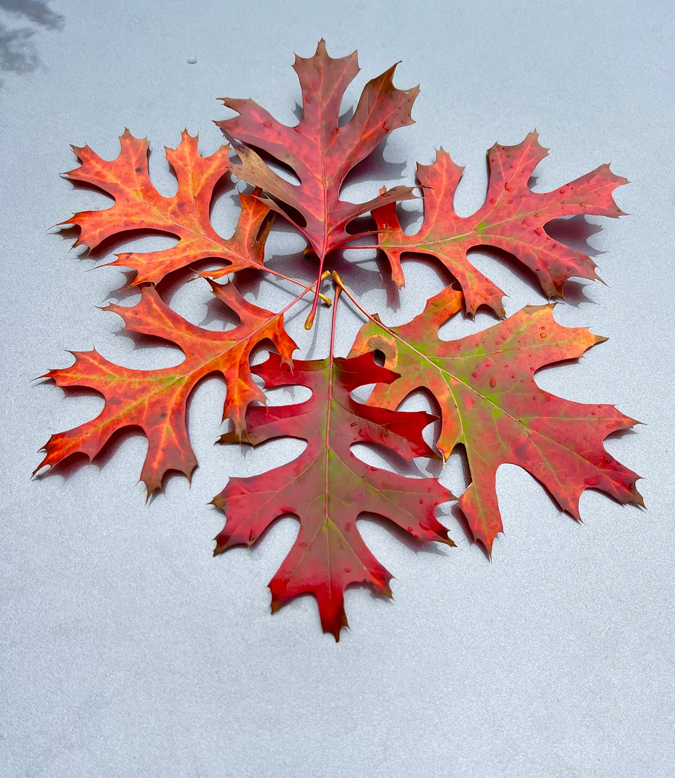 Walking in a local park on a overcast, wet day, I passed by an oak with incredible fall colors. Looking at the leaves reminded me of the sides of a snowflake. I picked six leaves of similar size and placed them on the hood of my car and shot.