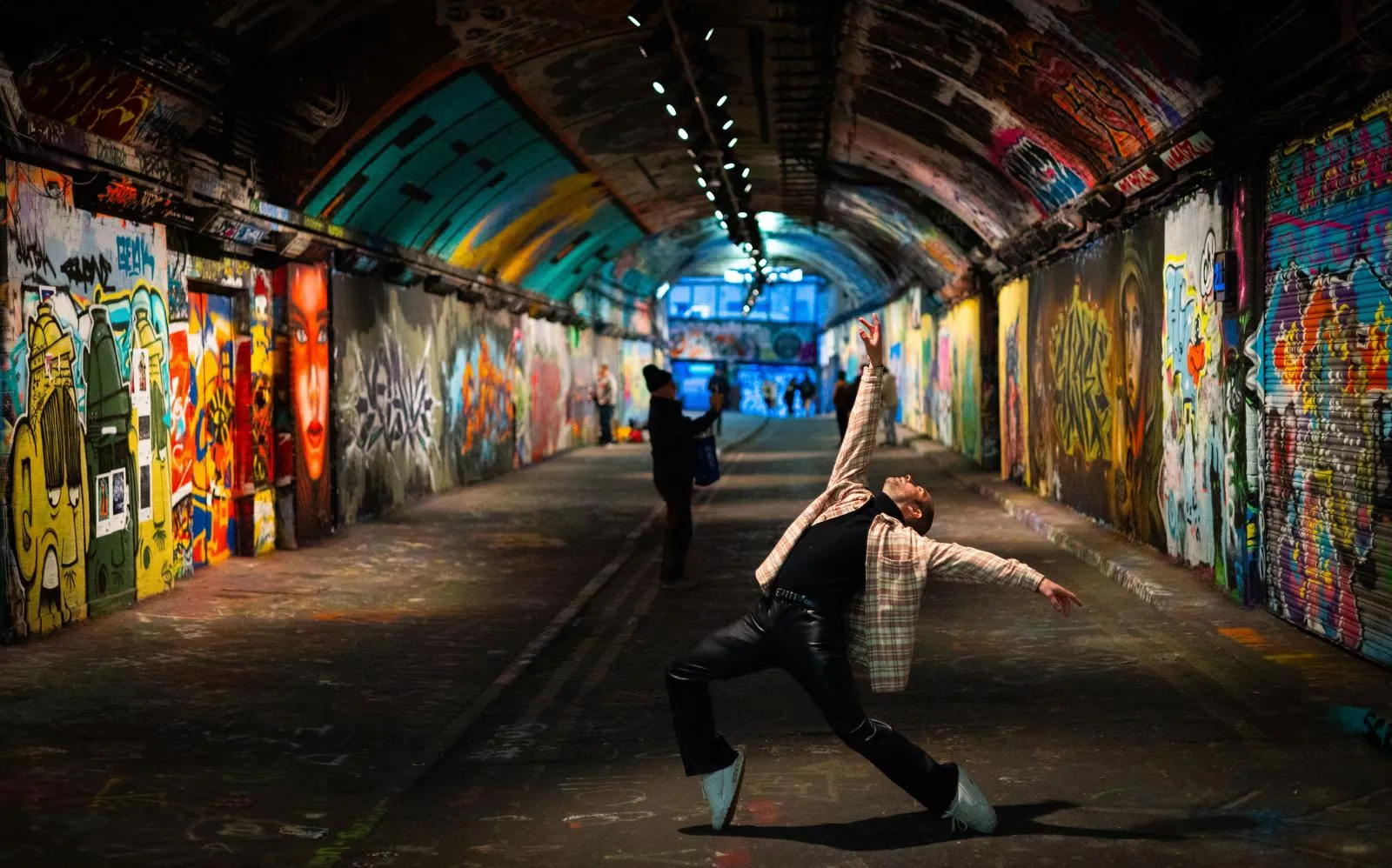 A dancer performs in the Graffiti tunnel under the Waterloo train station in London, England on Dec. 15, 2023.