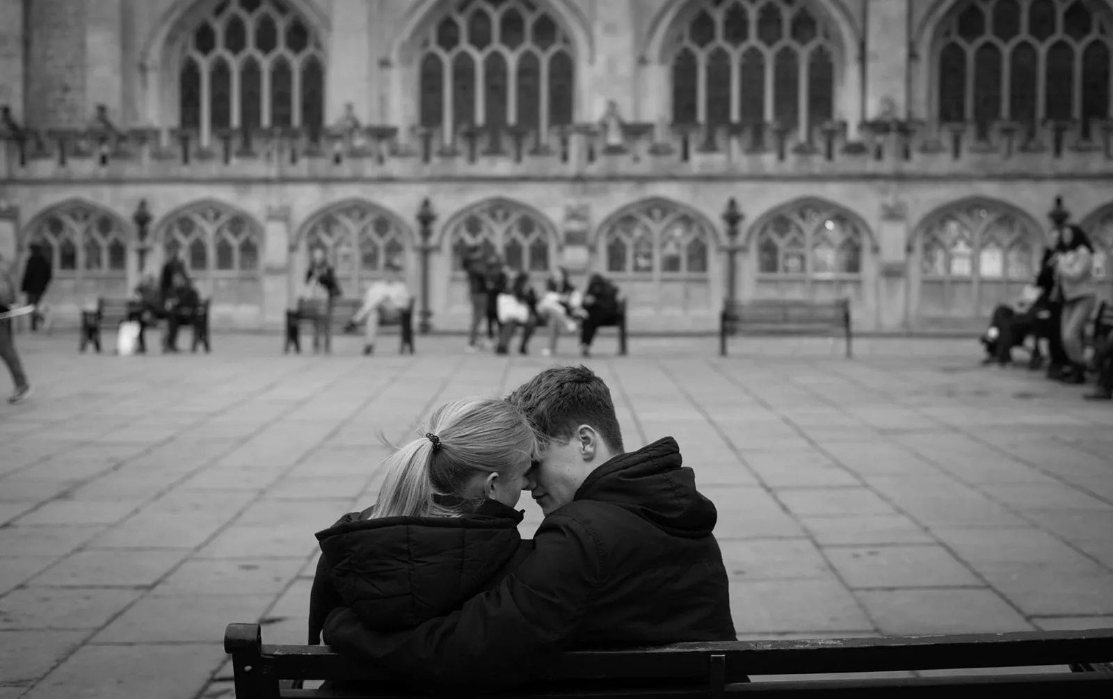 A young couple embrace while sitting on a bench in Bath, England on Dec. 18, 2023.