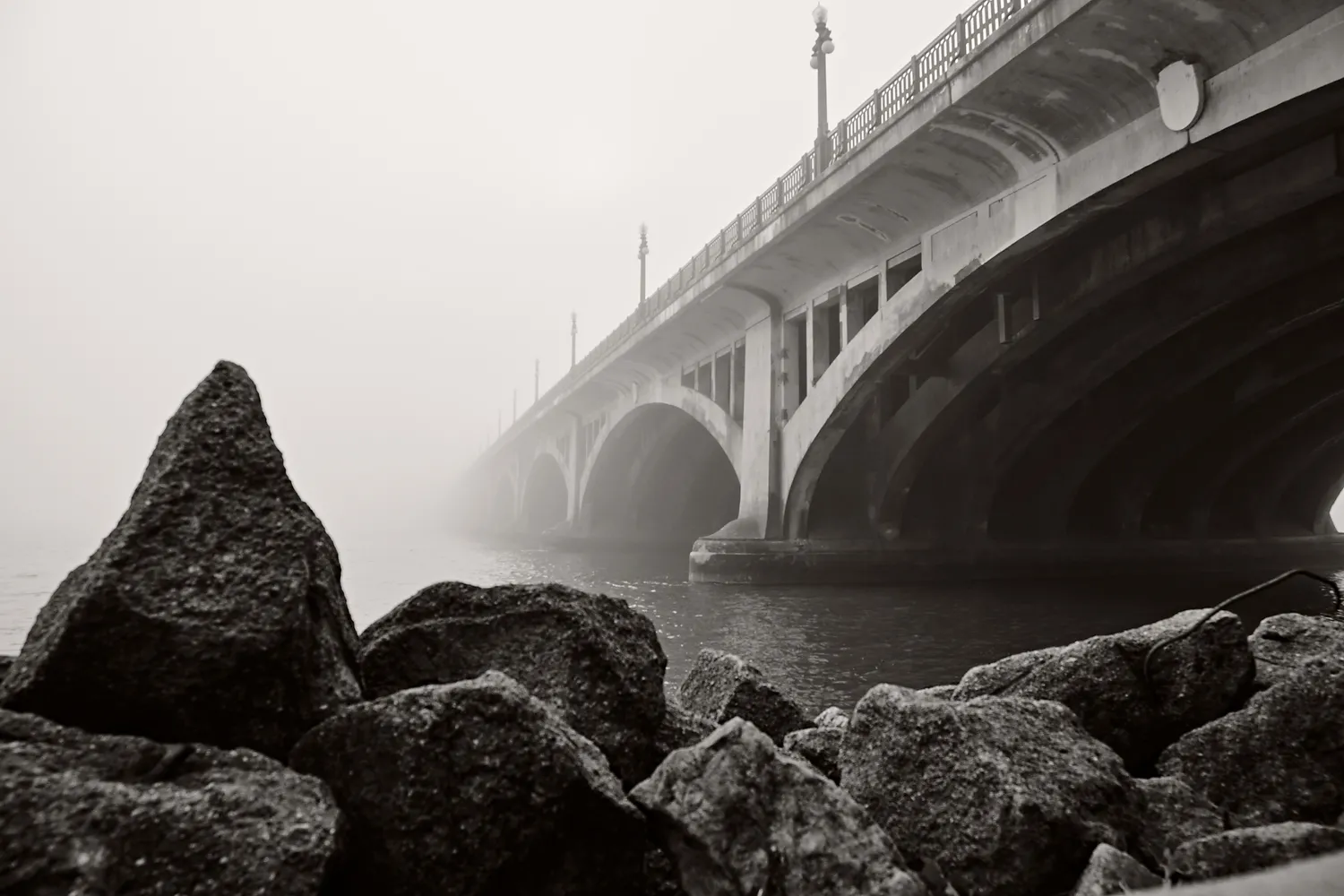 The MacArthur Bridge over the Detroit River in the fog on Christmas Day.