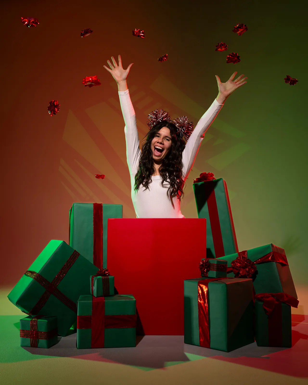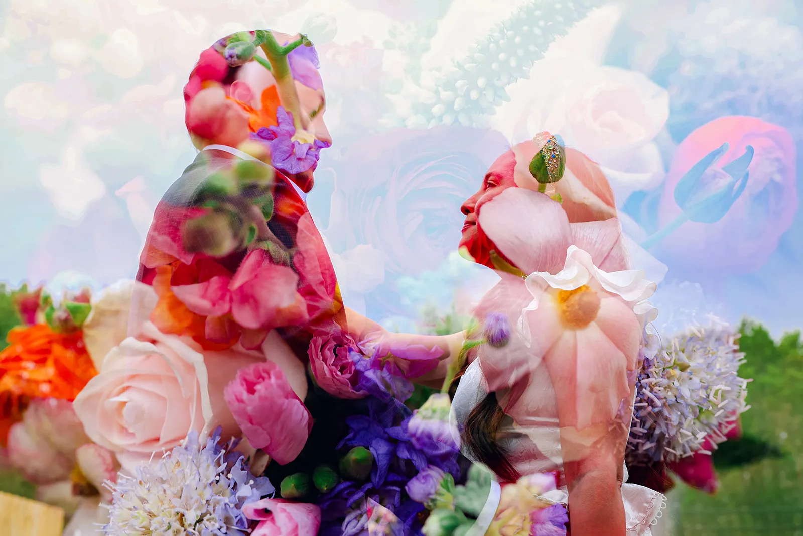 An in camera double exposure portrait of the bridal bouquet overlaid on a portrait of the bride and groom.