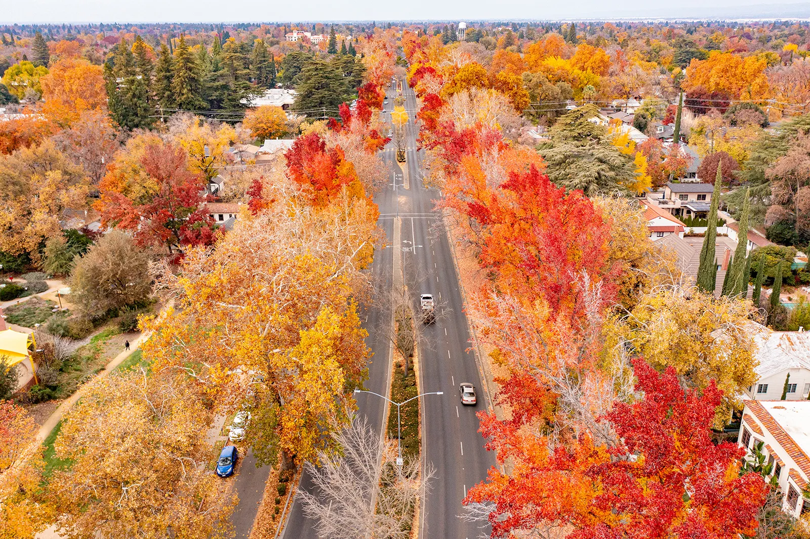 An aerial view of fall colors on the Esplanade on Thursday, November 30, 2023 in Chico, Calif.