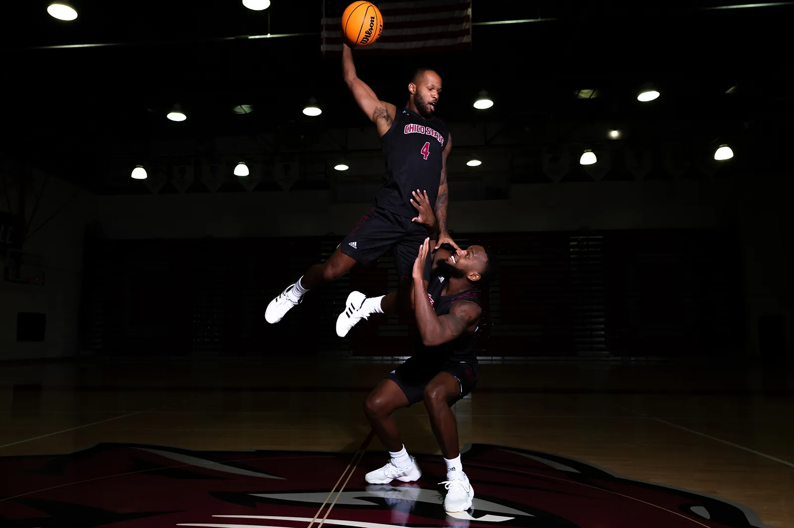 Men’s basketball #4 Joshua Hamilton (left) and #44 Kelvin Wright Jr. (right) take promotional photos on Thursday, October 12, 2023 in Chico, Calif.