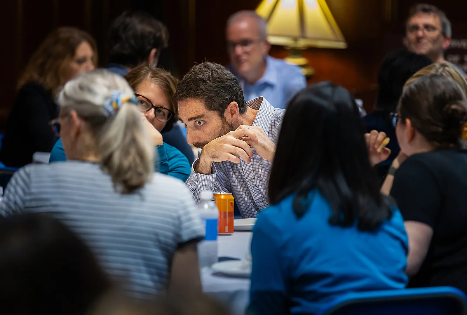 A participant in the Arts & Letters Trivia Competition intently listens to his colleague's guess to an answer on October 26, 2023.