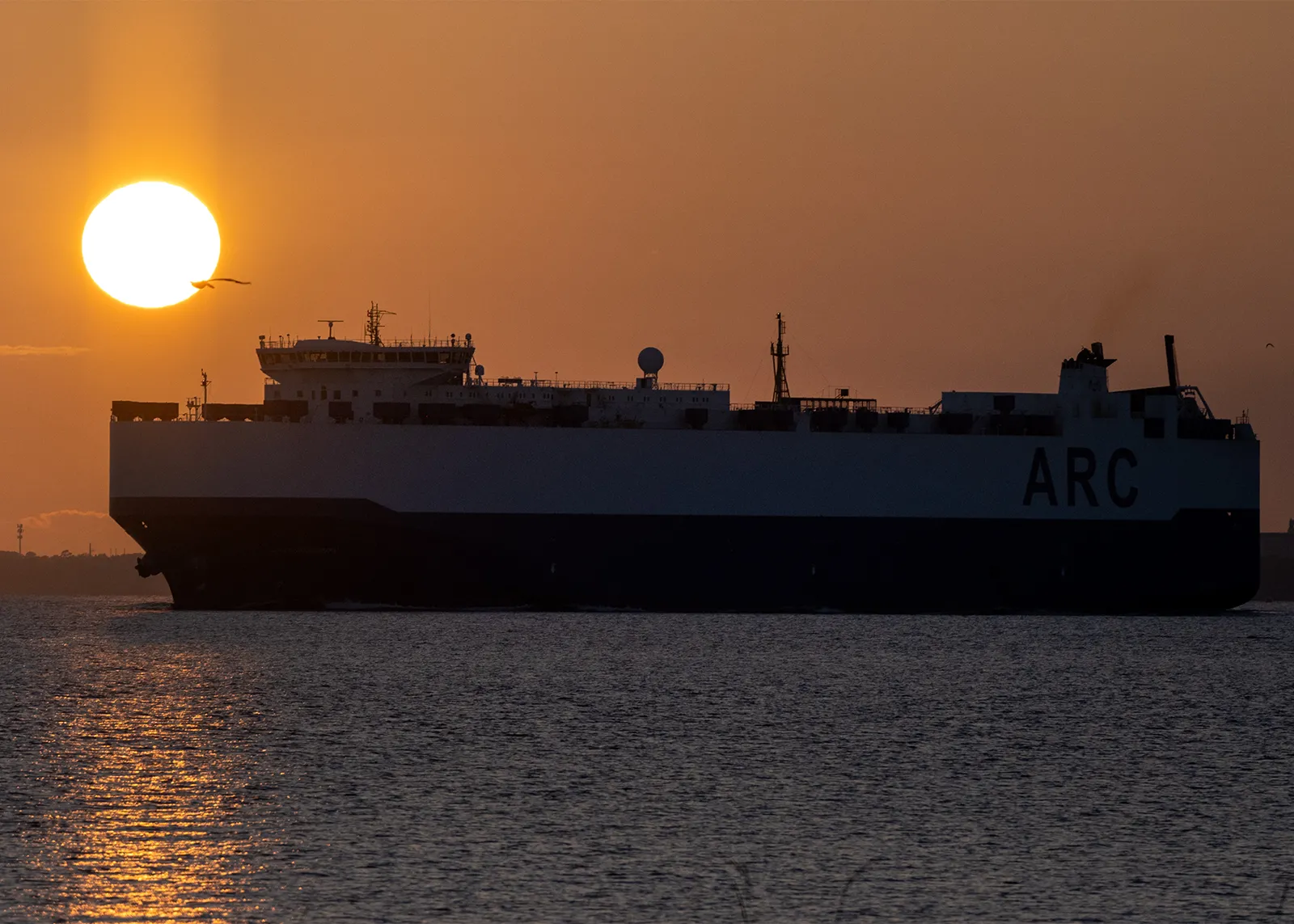 A cargo ship leaving Charleston Harbor with the setting sun. Taken from the Pitt Street Bridge Park.