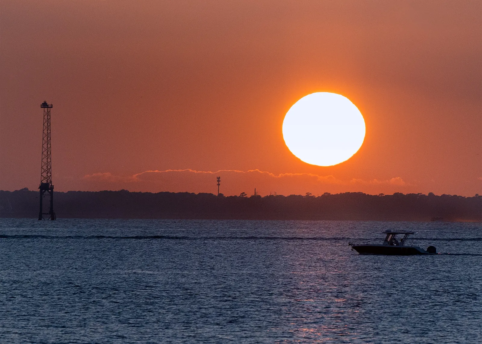 The setting sun over Charleston Bay, taken from the Pitt Street Bridge Park.
