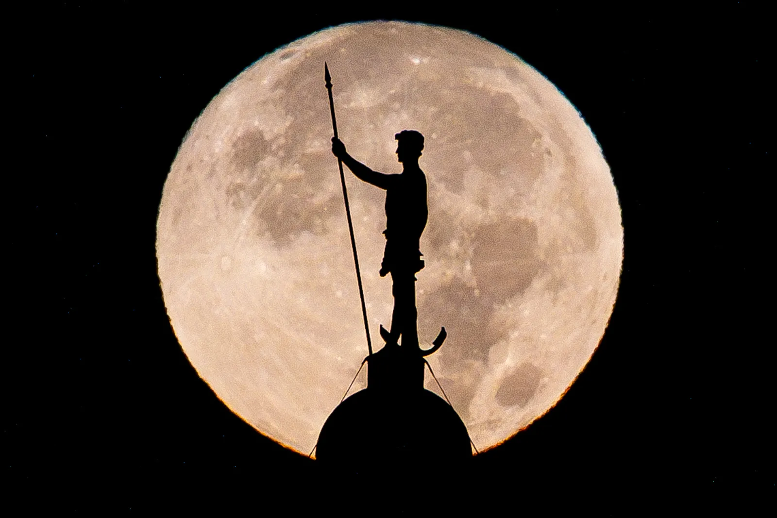 The nearly full Hunter's Moon silhouettes the Independent Man, high atop its perch nearly 300 feet above the Rhode Island State House. For just the second time since 1899, the iconic statue will be removed later this month for cleaning and repairs that will take about a year.