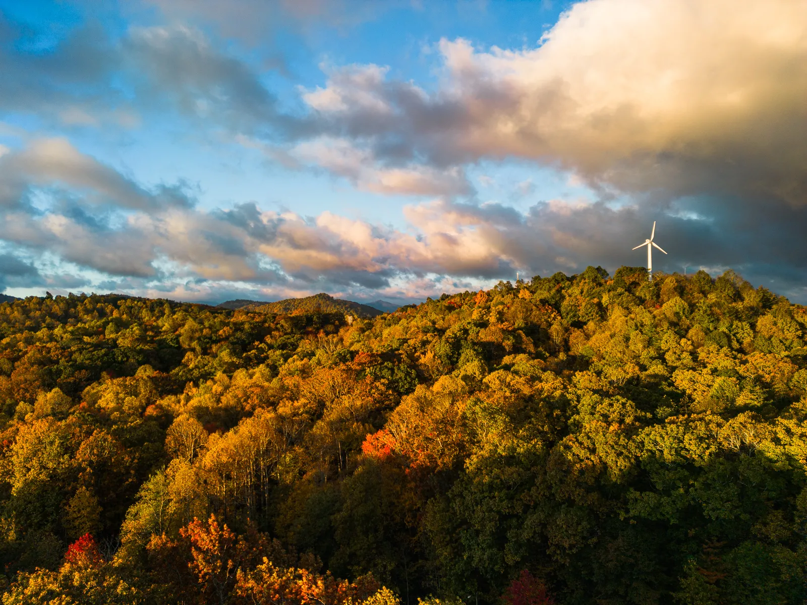 An aerial view of Appalachian State University's fall leaves and wind turbine on October 21, 2023.