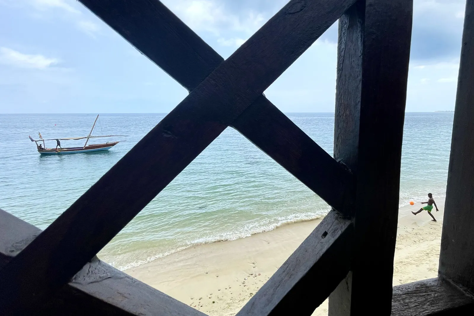 A boat traveling through the Indian Ocean passes a man kicking a ball on the western shore of Stonetown, Zanzibar, Tanzania on Tuesday, September 12, 2023.