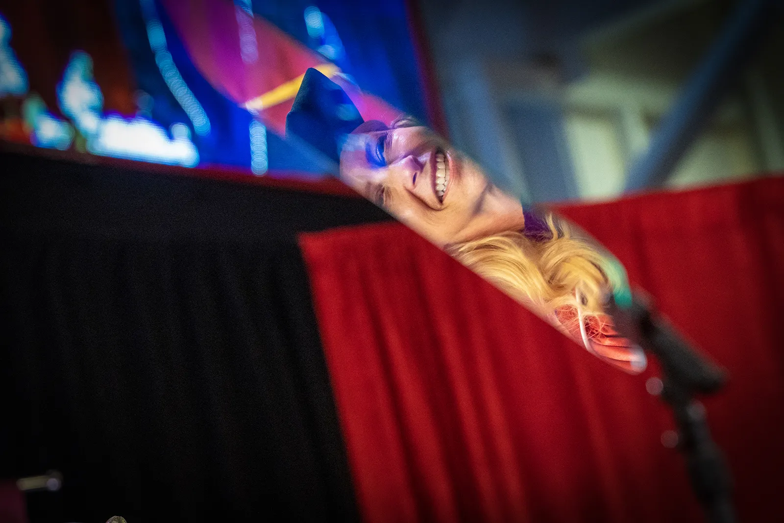 Stony Brook University's President Maurie McInnis' reflection on the teleprompter at the Doctoral Hooding Ceremony.