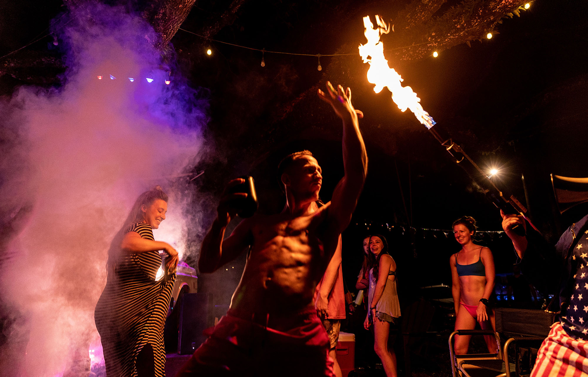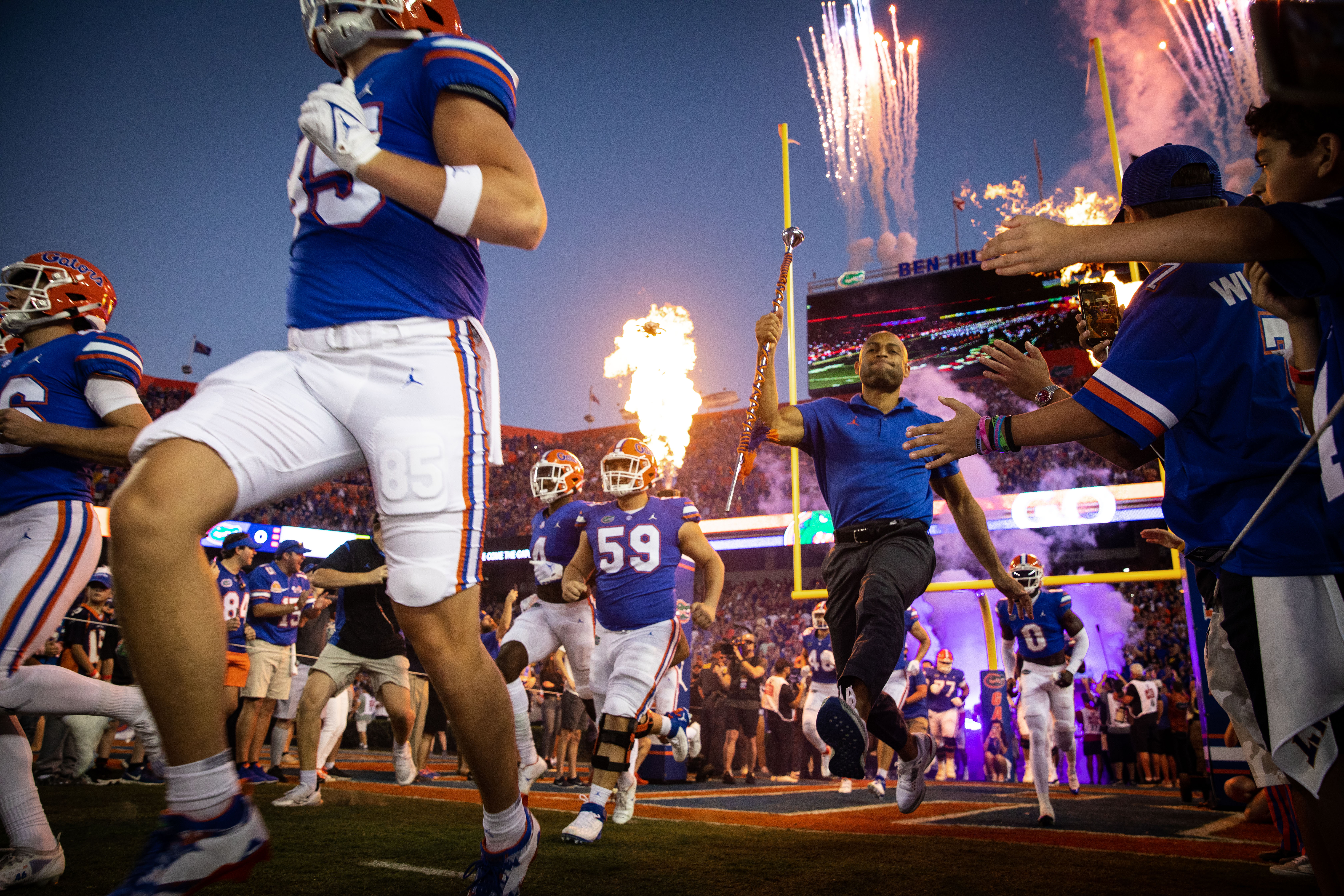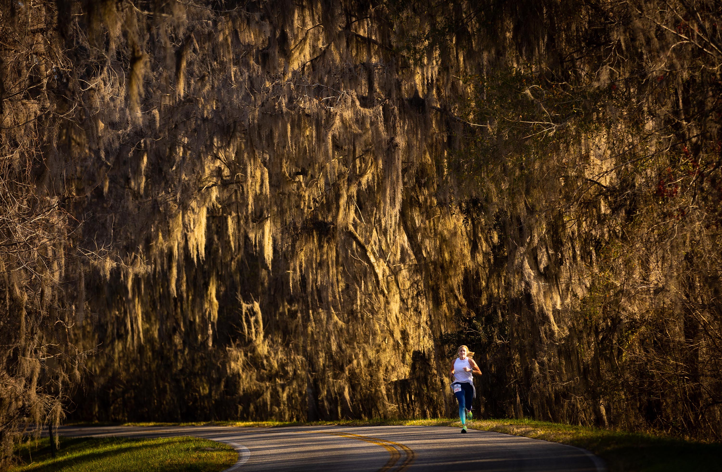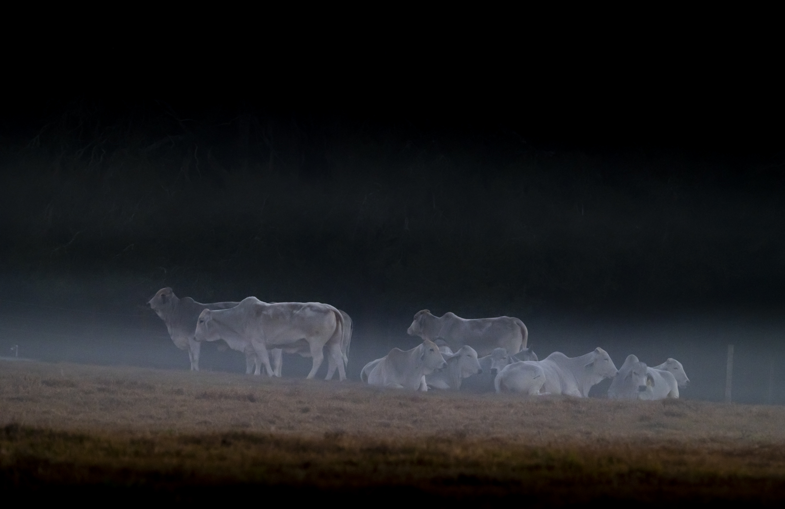 Brahma cows rest in patch of early morning fog and light at the Beef Teaching fields on the University of Florida campus.