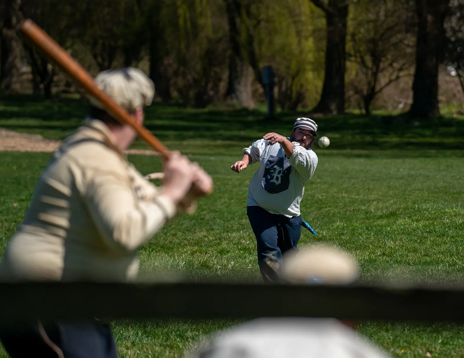 A vintage base ball hurler throws an underhanded pitch to the striker waiting at the plate. The game is played by traditional 1800s rules, including the equipment, uniforms, field specifications, and customs of the period.