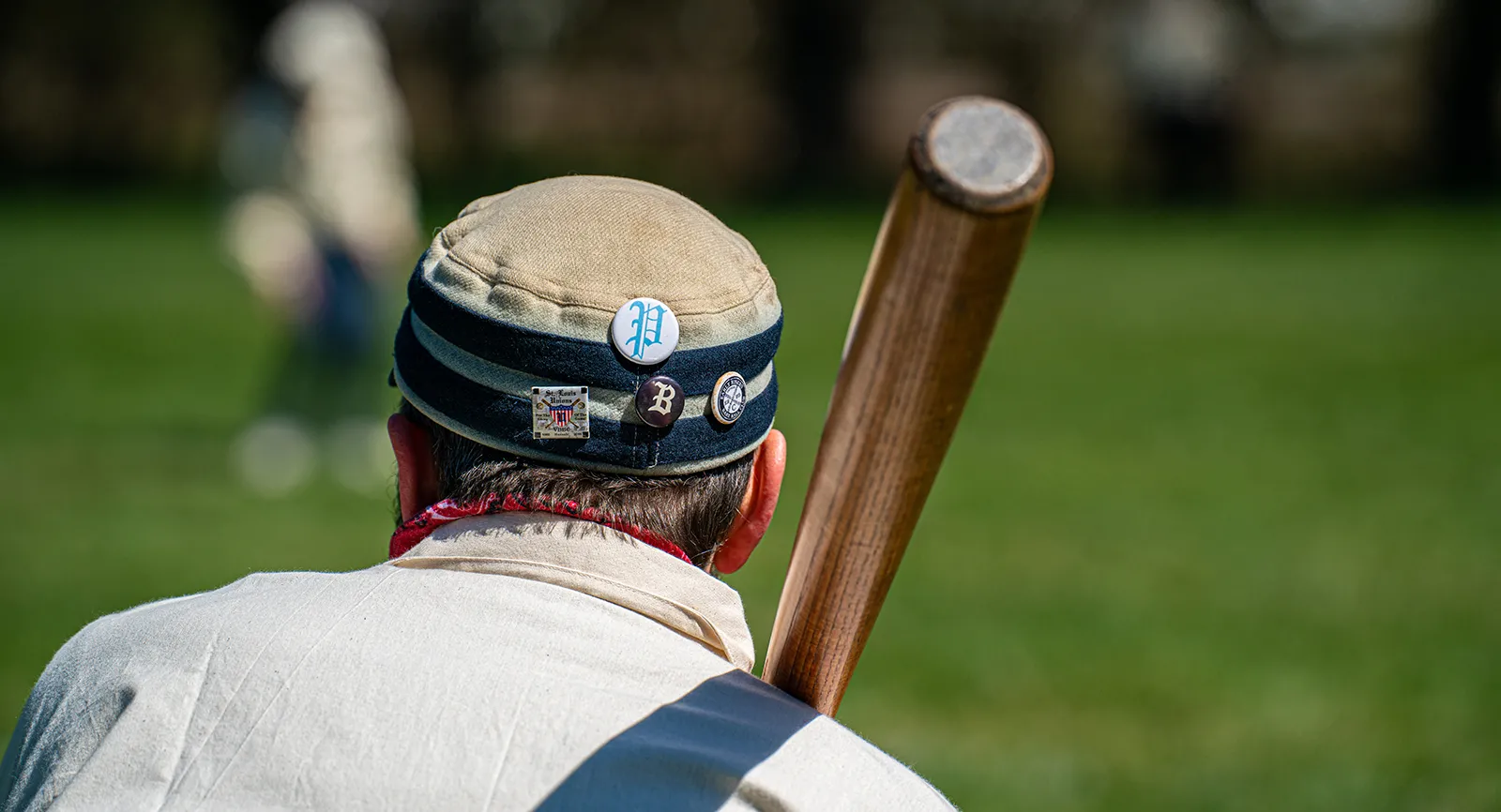 A vintage base ball player displays pins from various reenactment tournaments and teams across the United States. The game is played by traditional 1800s rules, including the equipment, uniforms, field specifications, and customs of the period.