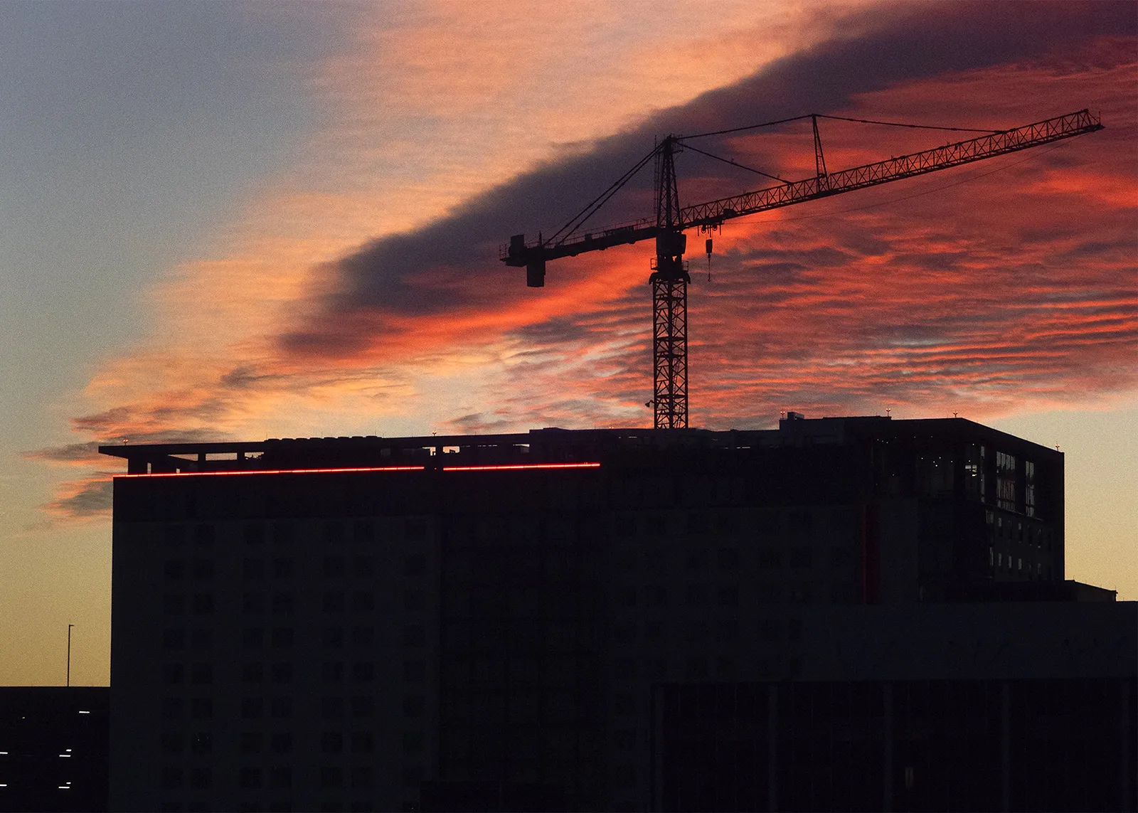 Red clouds just after sunset highlight a construction crane and another building being constructed in Houston’s Texas Medical Center.