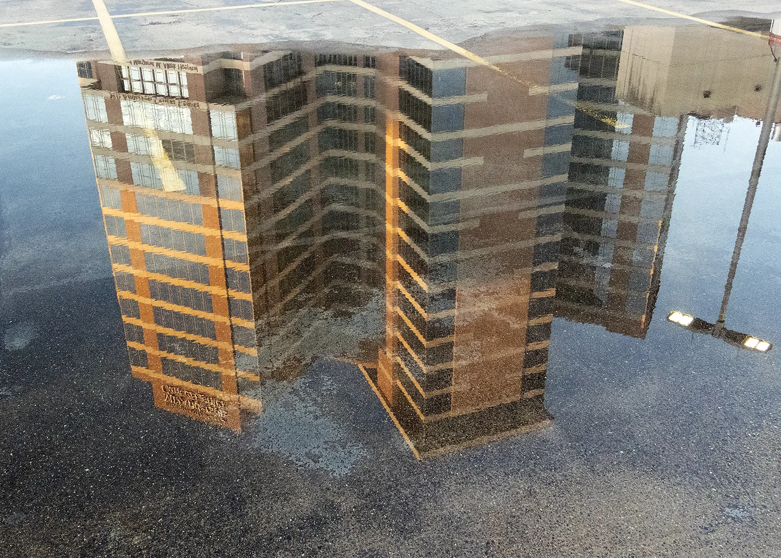 The setting sun highlights the reflection of the multi-storied Alkek Hospital Building of Houston’s MD Anderson Cancer Center in a rain puddle, located on the top floor of a parking garage across the street.