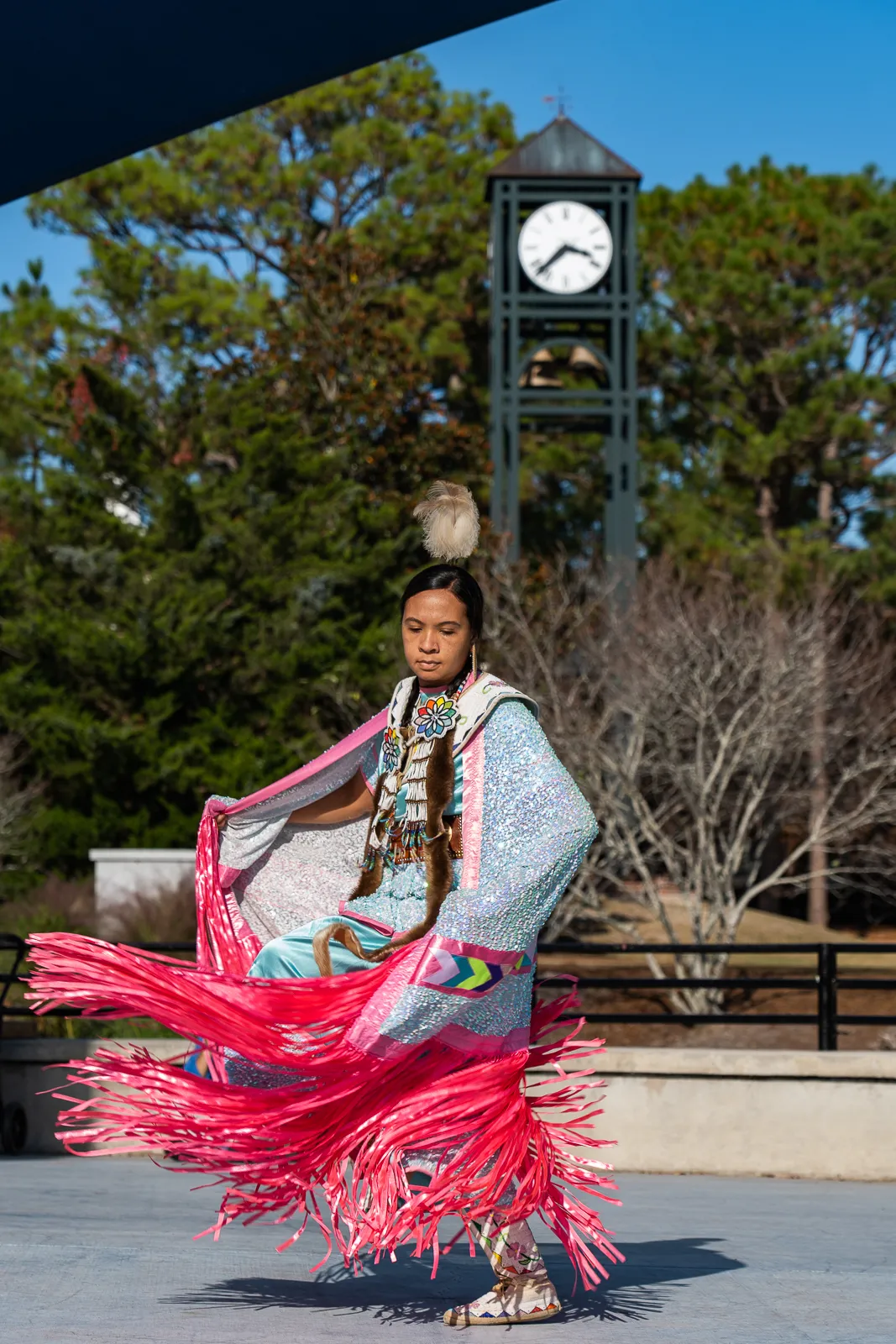 The UNCW Office of the Arts brought the community together at UNCW's Amphitheater and kicked off the Indigenous Peoples' Celebration with native dancers and various performances on November 3, 2022. This local native dancer performs in the amphitheater with Leutze Lakes and the iconic UNCW Clocktower in the background.
