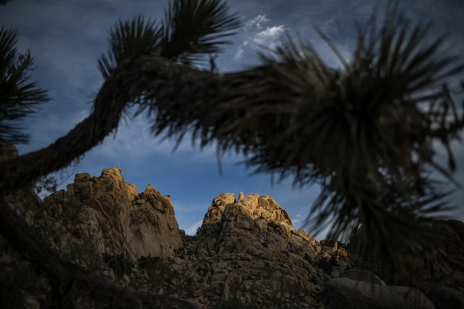 The sunsets over boulder formations and a joshua tree at Joshua Tree National Park.