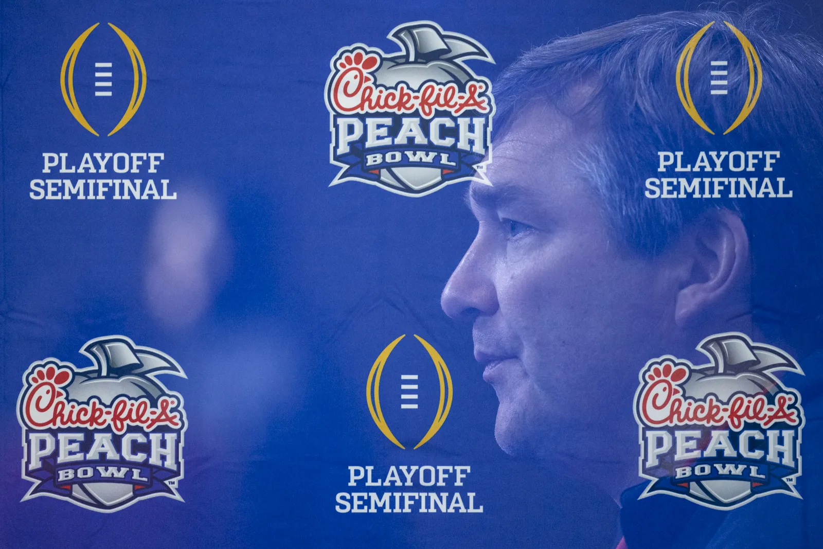Georgia head football coach Kirby Smart appears at Media Day prior to the Chick-fil-A Peach Bowl, overlaid in an in camera double exposure with a closeup the press conference background.