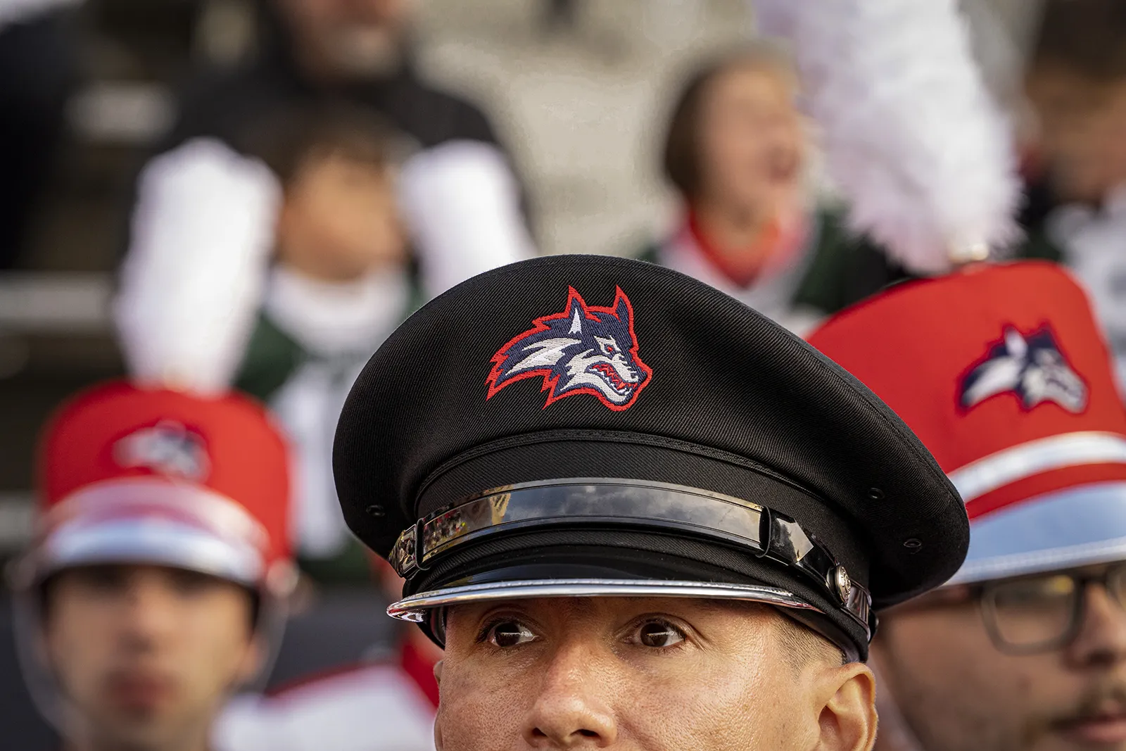 Director of the Spirit of Stony Brook Marching Band Dr. Justin Stolarik keeps an eye on his members as they perform at the Homecoming.