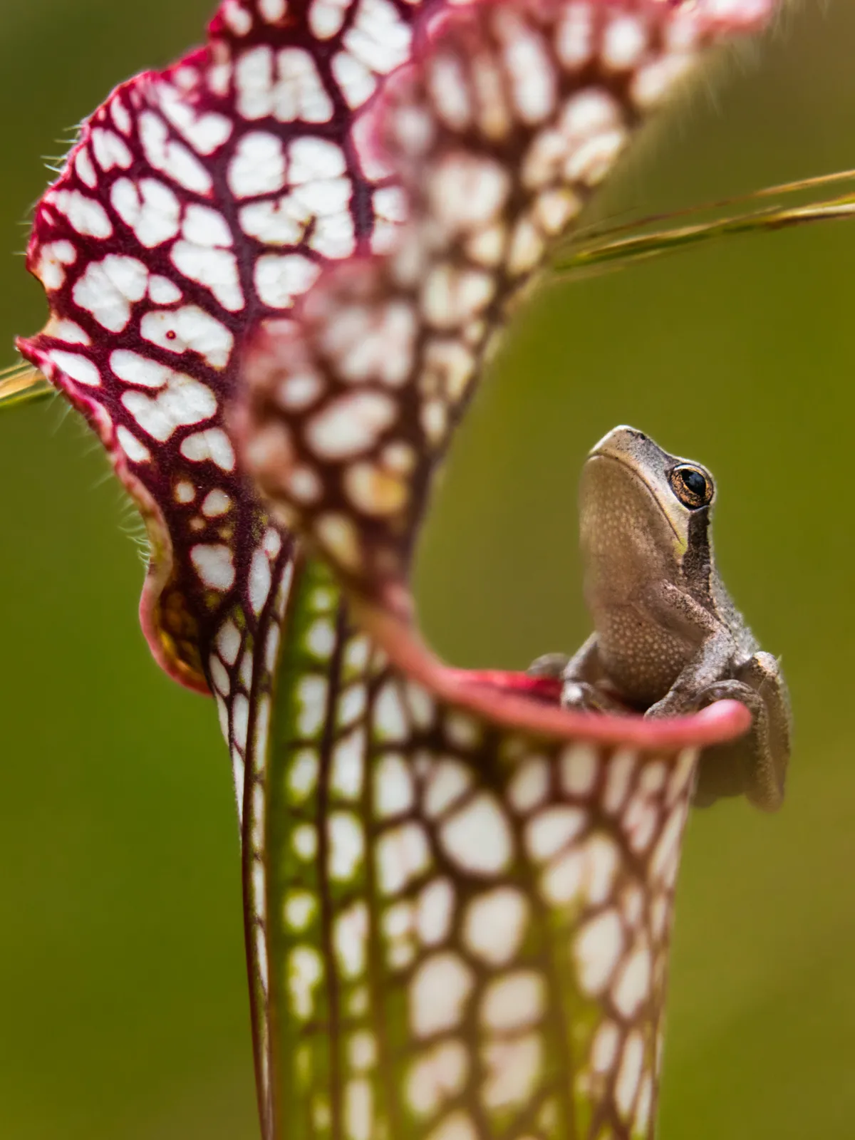 A Squirrel Treefrog (Hyla squirella) hangs out on the Crimson Pitcher Plant (Sarracenia leucophylla) awaiting its next meal. This image was captured while filming for a documentary focusing on the natural treasures of Southeastern North Carolina for the University of North Carolina Wilmington.