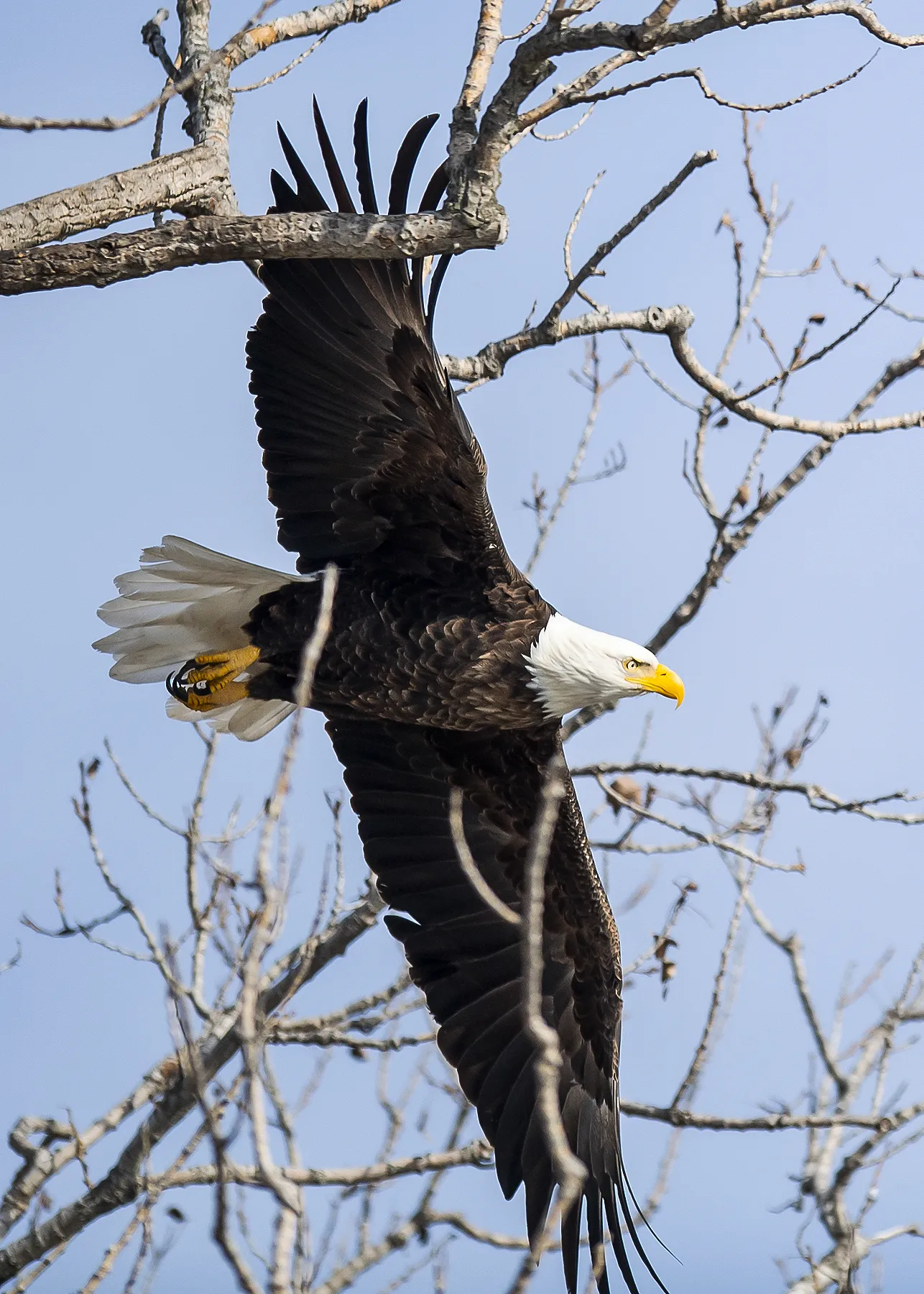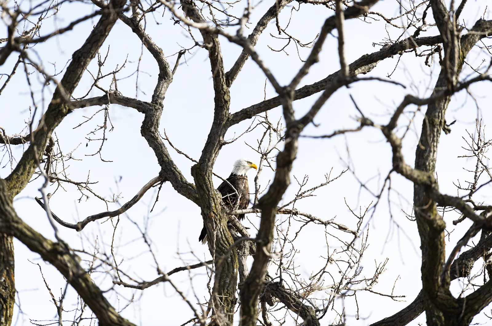 A bald eagle perched in a tree alongside the Mississippi River in Keokuk, Iowa.