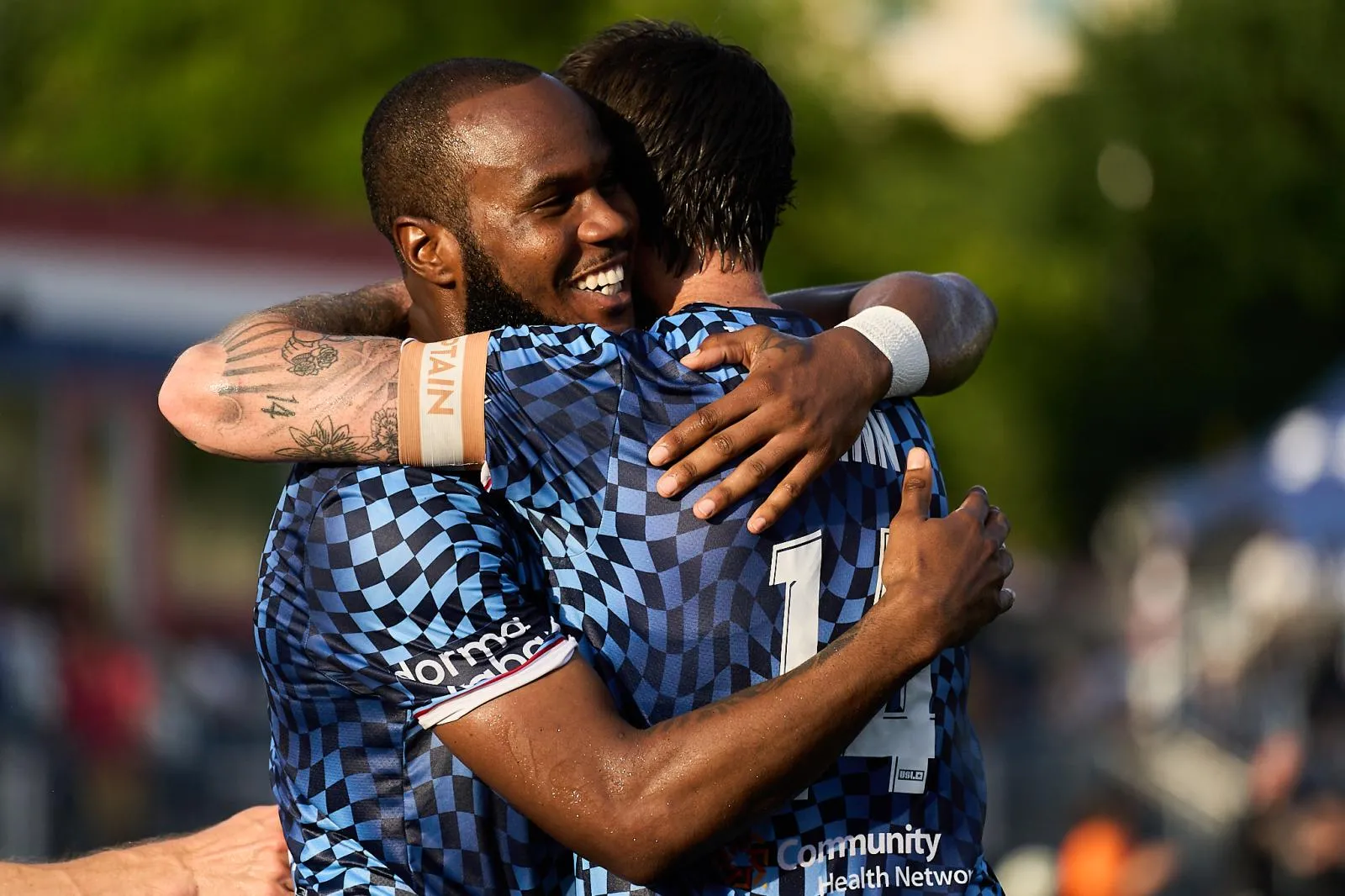 Indy Eleven players Romario Williams and Aodhan Quinn embrace and celebrate a game winning goal against FC Tulsa.