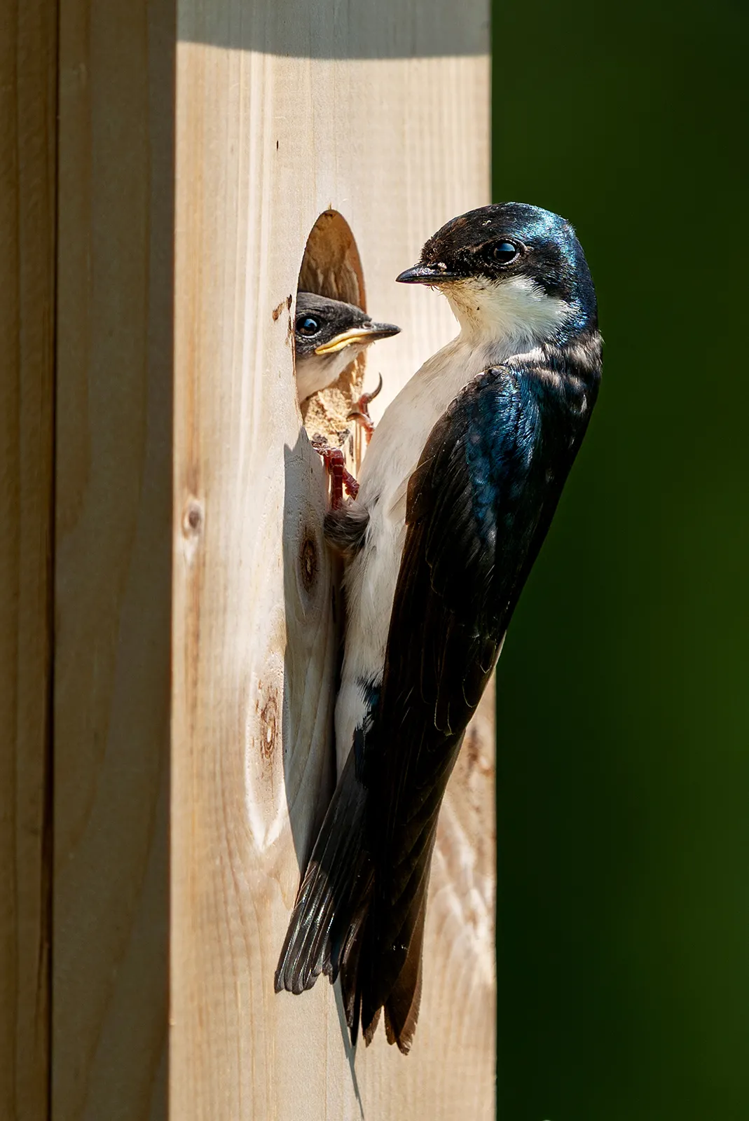 WATERVILLE, MAINE – JUNE 23: An adult tree swallow brings an insect offering to its young in its nest in a recently installed nest box near the Harold Alfond Athletics and Recreation Center on Monday, June 23, 2025. Anna Forsman, Assistant Professor of Biology, in collaboration with Operations and Maintenance, installed over 60 nest boxes along the walking path near the HAARC around Johnson Pond, and near the community garden.