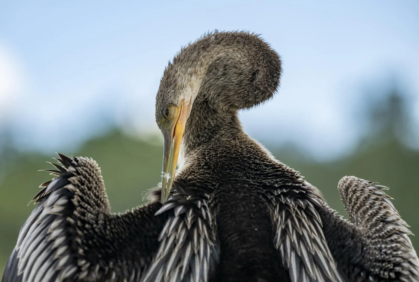 This beautiful anhinga and I shared a mutual understanding, we both needed respite from the blistering sun and the shaded area was a small space. Neither of us were leaving. I was recently hiking at Sweetwater Wetlands Park on assignment for my university and the sun and heat were getting brutal. I set my sights on a small sheltered bench at the edge of one of the many ponds. As I walked closer, I saw this anhinga preening on the banister in the shade. I slowed my approach and began gently talking to the bird, sharing that I just needed a little break from the sun too and that I would not harm it. We could share the space and I would be kind. It paused its preening and watched me closely as I slowly sank onto the bench. I sat still and waited to see what it would do. Once it returned to preening I understood it had accepted my presence. I kept my promise but slowly pulled my nikon Z6 and 100-400 from my bag and documented this dance-like ritual. What a stunning bird. It was still there when I decided it was time to hike some more. I am grateful this bird trusted me and allowed me to share this space and moment with it. Always be respectful when in the presence of wildlife.