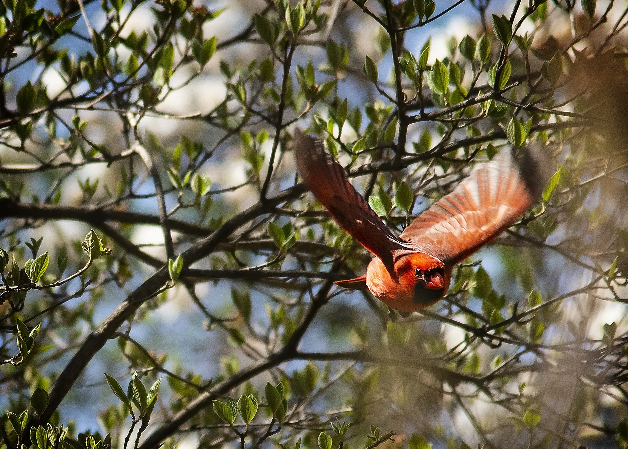 I was out on campus with a 24-120 mm f 4 lens getting candids of a student event with a lens that was not suitable for bird photography but caught this lucky little cardinal shot.
