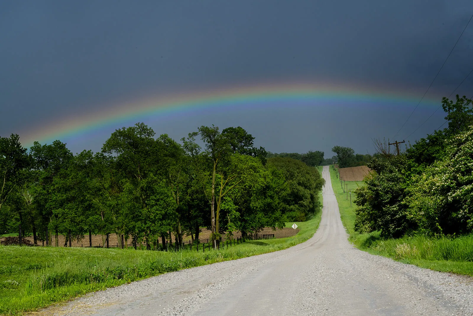 A rainbow spans a gravel road just east of my house after a spring storm.