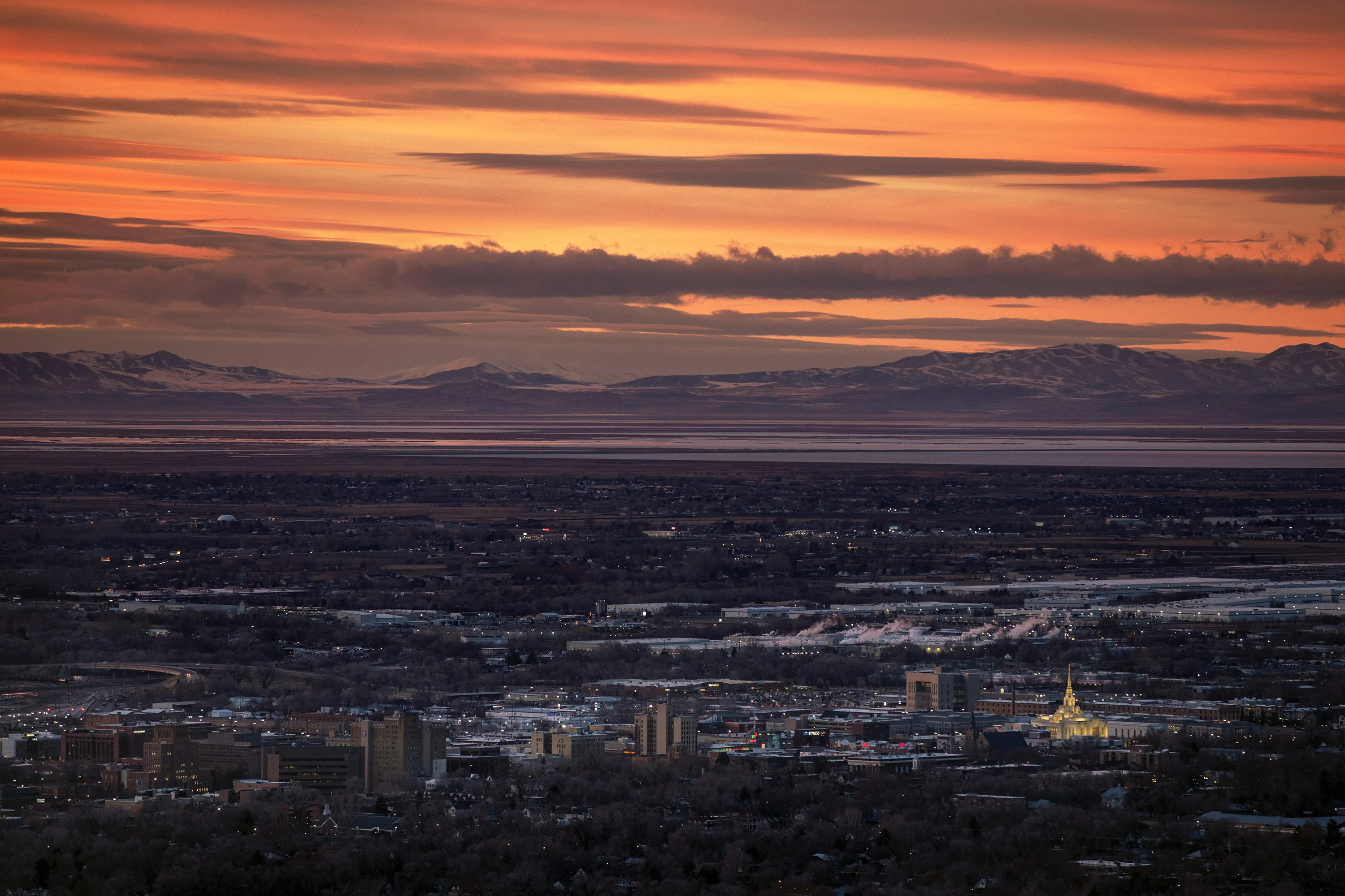 The sun sets over Ogden and the Promontory Mountains as seen from the hiking trails above Weber State University. February 4, 2021.