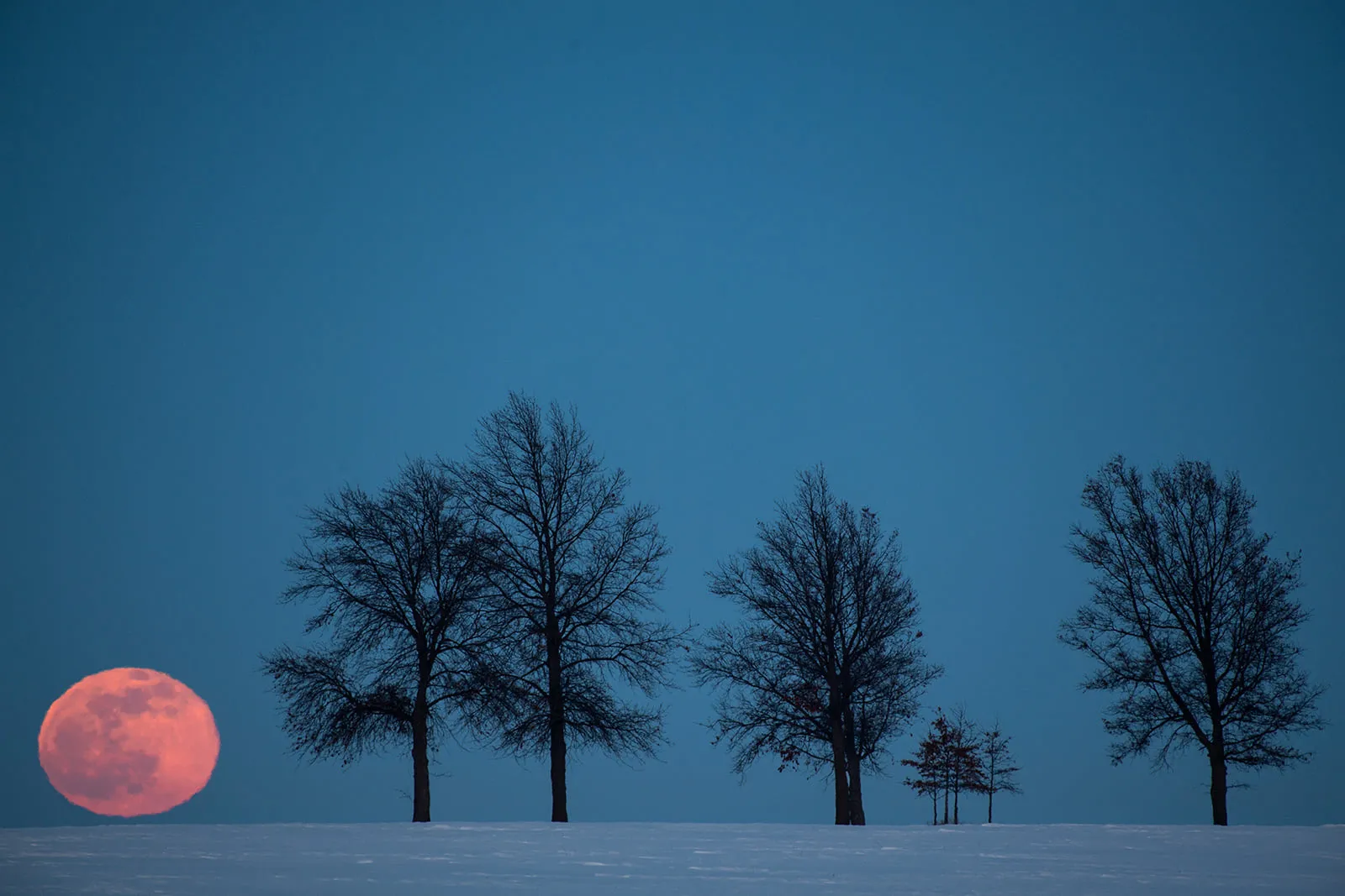The January full moon, sometimes called the Wolf Moon, rises over a snowy field.
