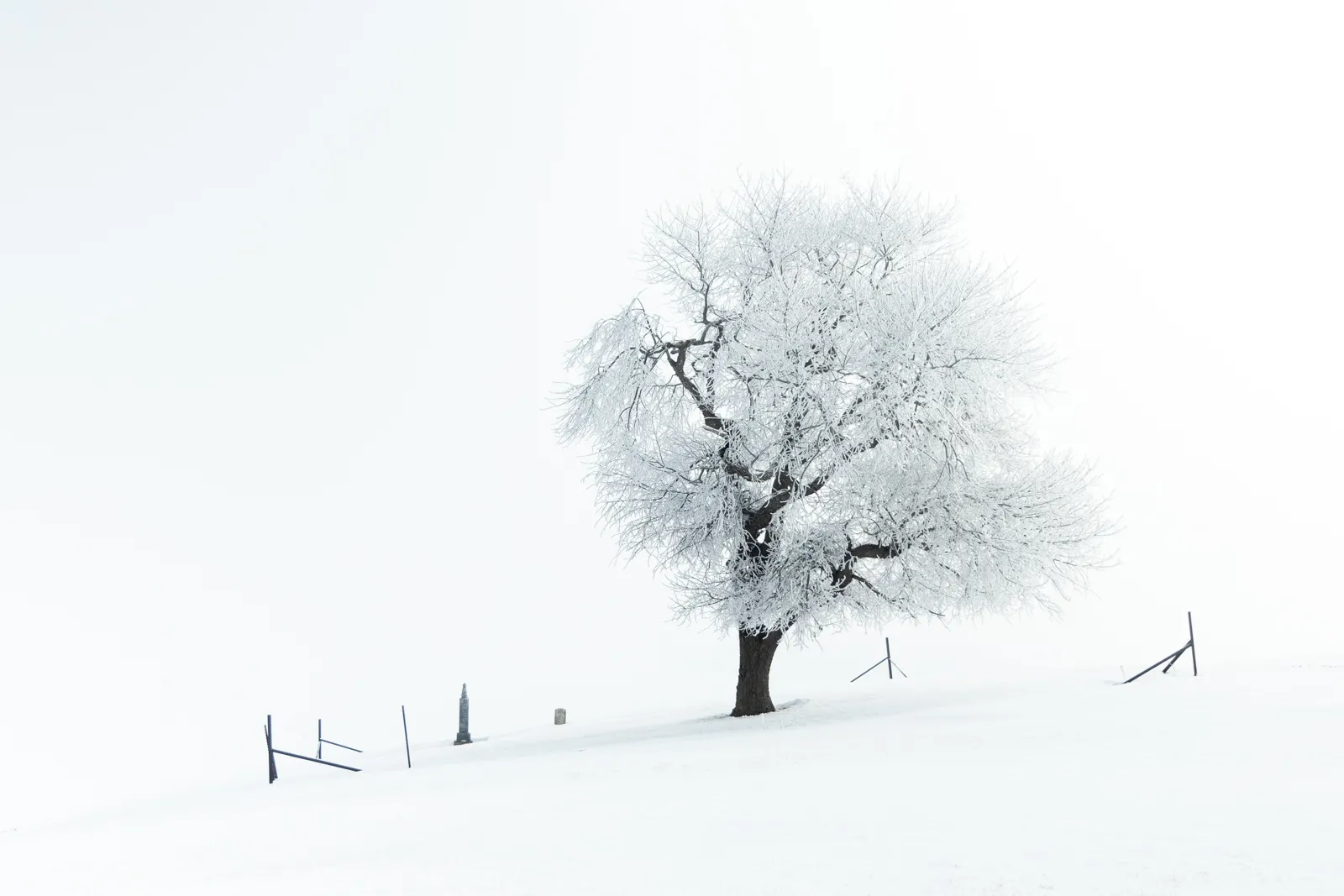 A pioneer cemetery in rural Jasper County, Iowa is enveloped in fog.